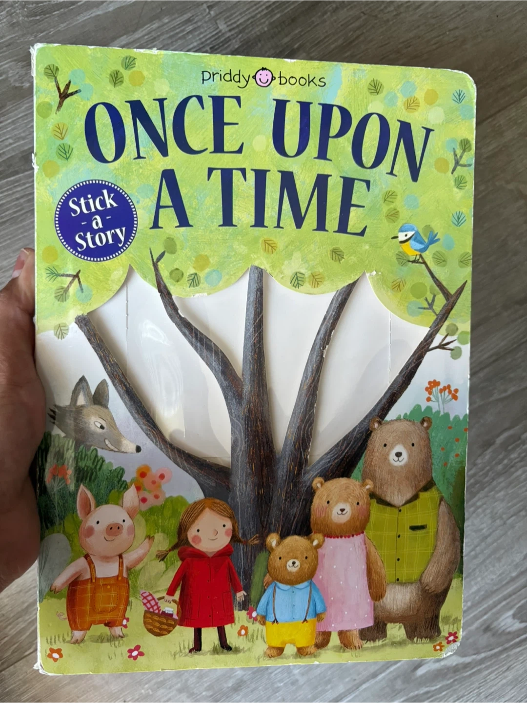 It’s a new format for Priddy Books. It has sweet illustrations and a clam shell of reusable sticker play pieces embedded in the cover which can be used anywhere in the book.