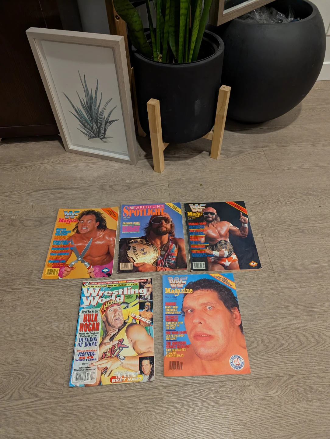 Selling a collection of 5 vintage WWF wrestling magazines. Includes issues featuring Hulk Hogan, Bret Hart, Macho Man, and Andre the Giant! Great for any wrestling fan or collector