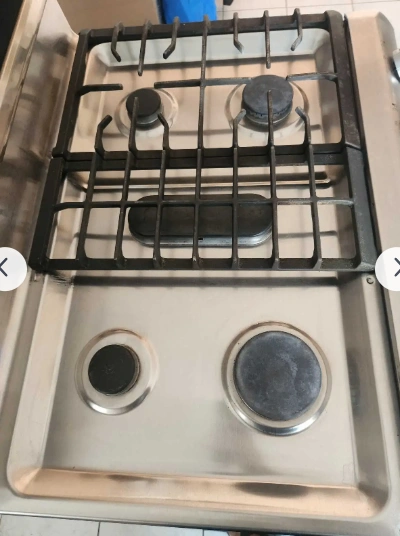 range is used, so it has some wear and tear, but it functions perfectly well except **2 knobs (for both back burners) which do not turn and need repair/replacement**