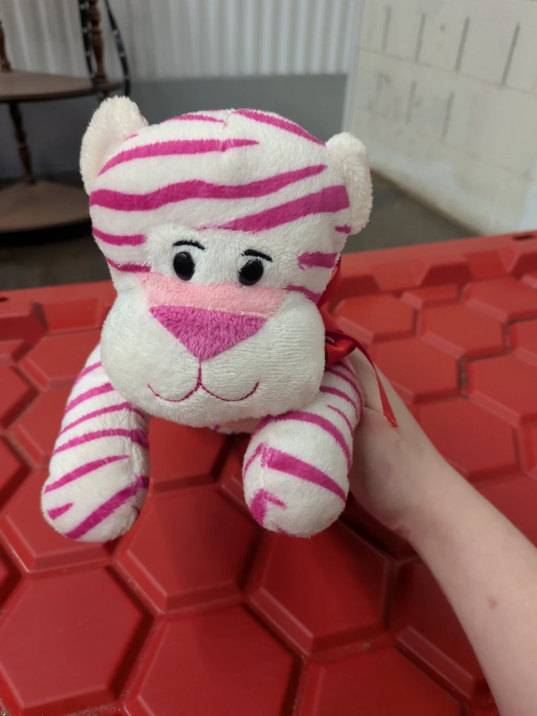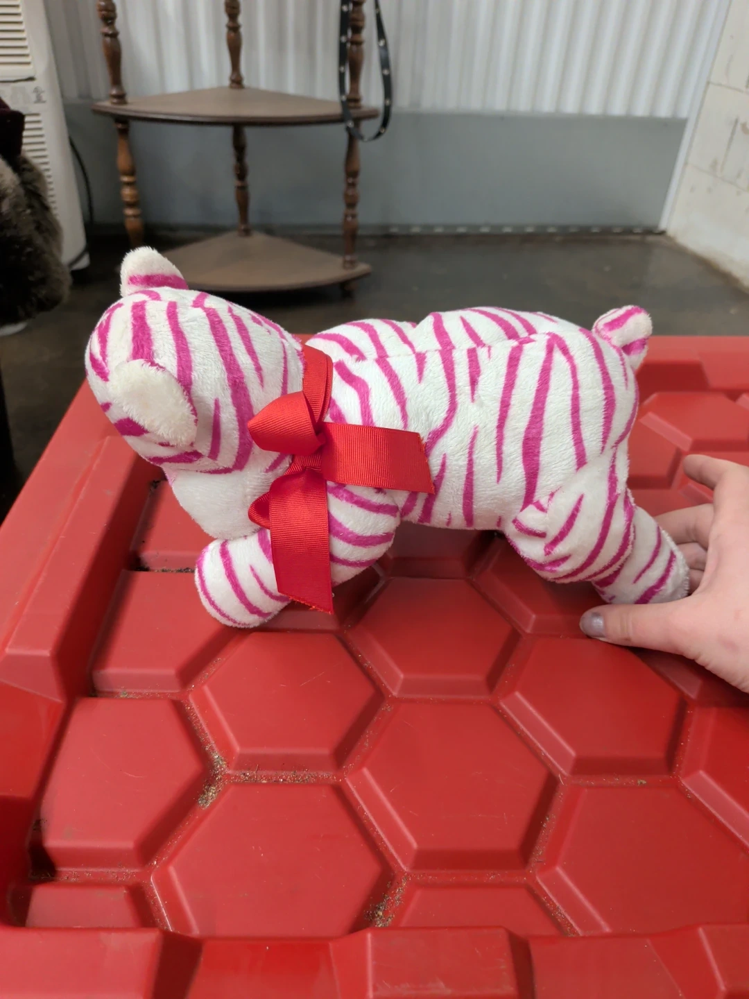 This is a soft plush toy tiger with white and pink stripes. It has a red ribbon bow tied around its neck. The plush is stuffed and measures approximately 8-10 inches long.