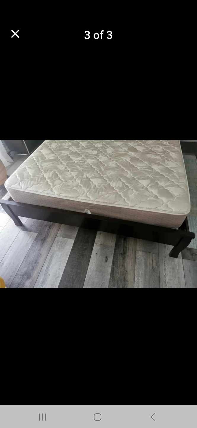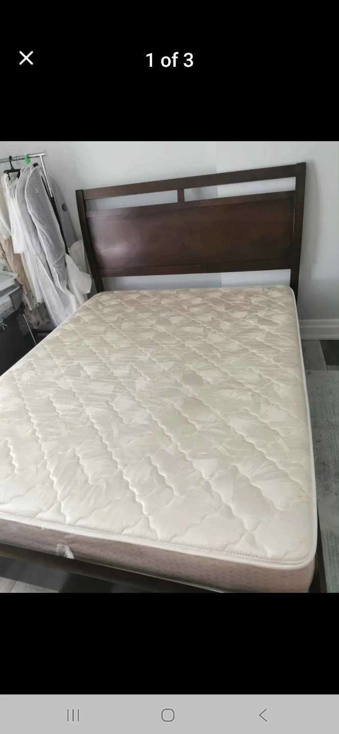 A sturdy wooden bed frame with a comfortable mattress included. The frame is dark brown wood. It's a standard size bed.
