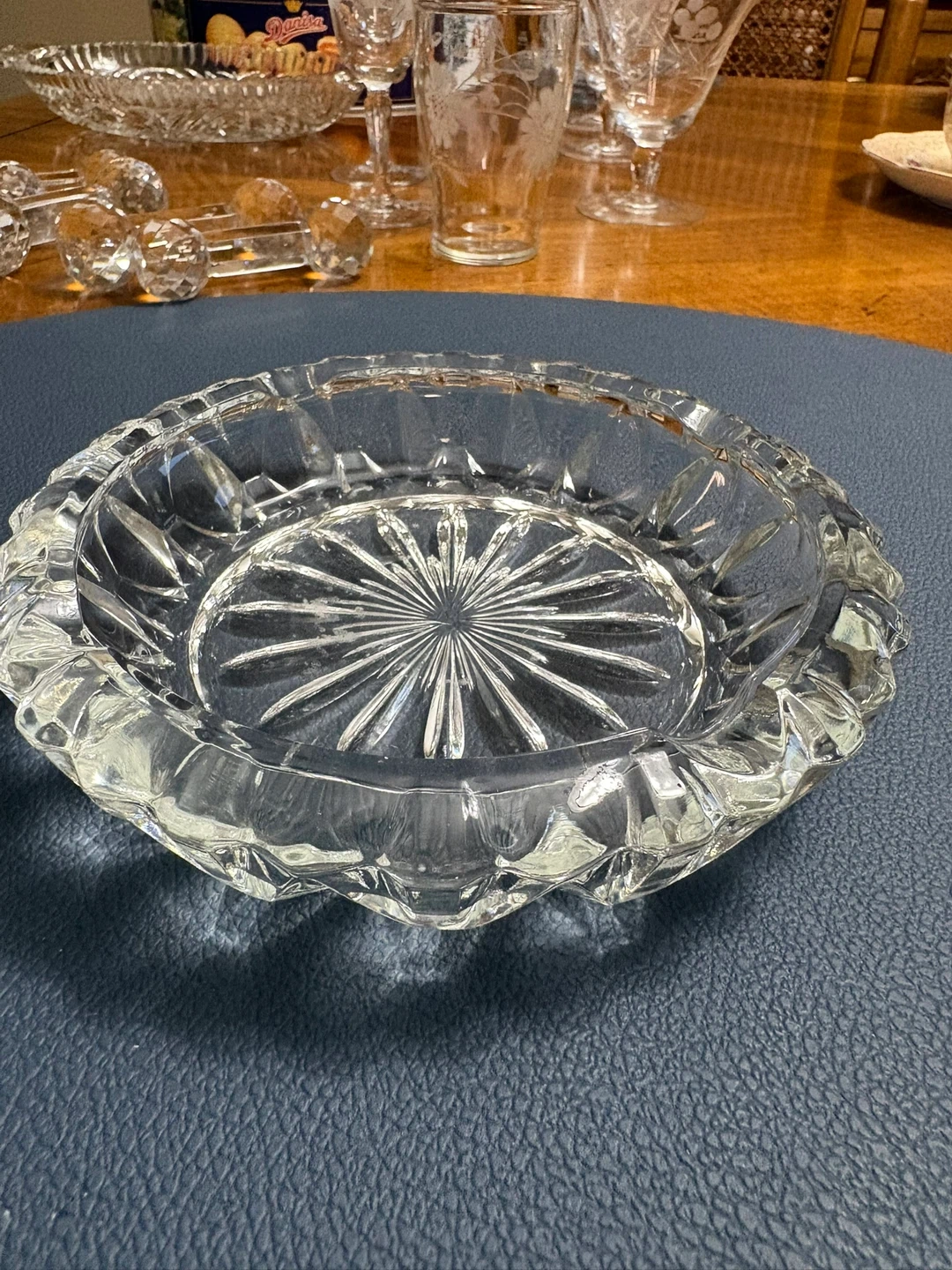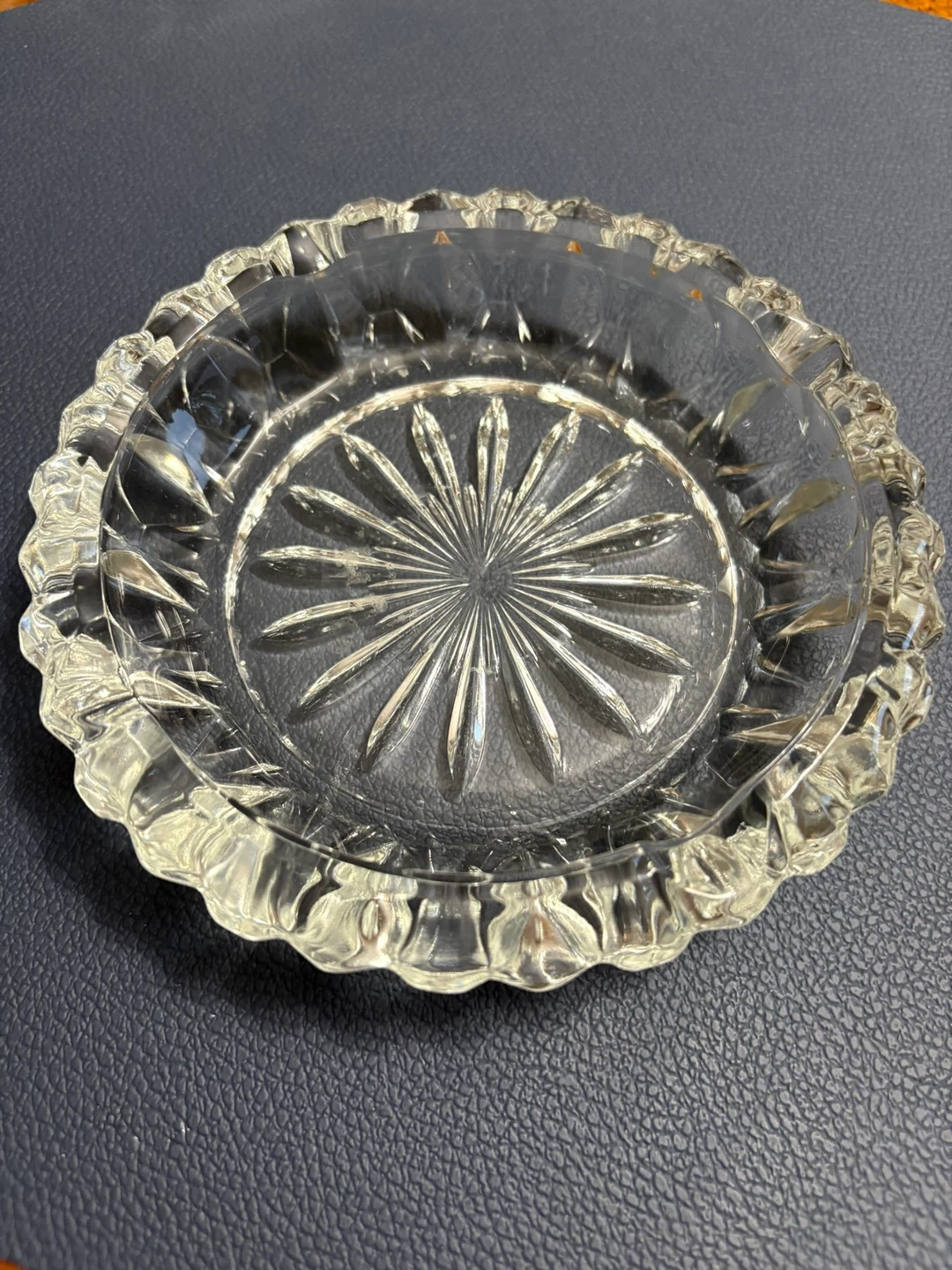 A beautiful vintage glass ashtray with a sunburst pattern. It's made of clear crystal glass and has a decorative fluted rim. Perfect for use or as a decorative piece.