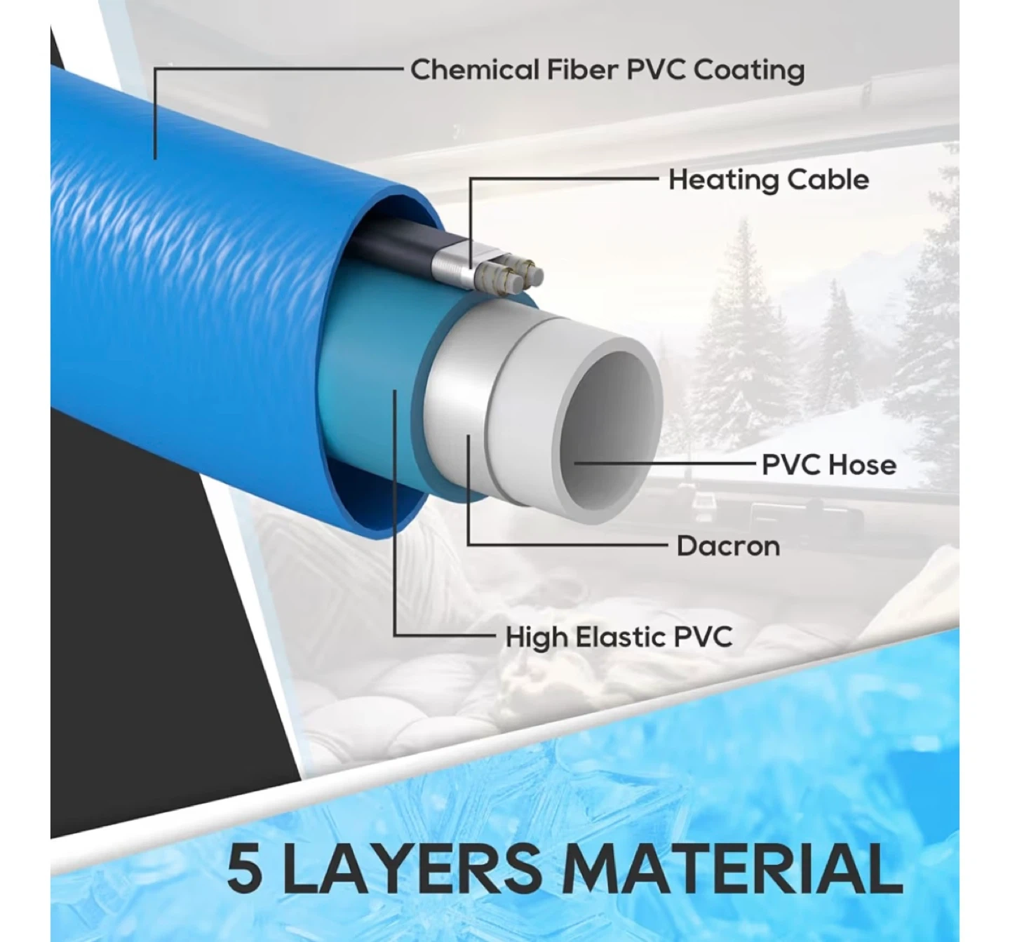 Keep your water flowing all winter long with this Rygard heated drinking water hose! It provides freeze protection down to -20°F. The hose features a 5-layer material construction with a chemical fibre PVC coating, heating cable, PVC hose, Dacron, and high elastic PVC. It also has a temperature sensor that turns on at 47°F and off at 60°F, so you can be sure your water is always at the perfect temperature
