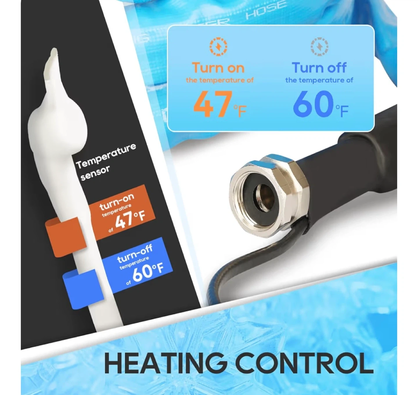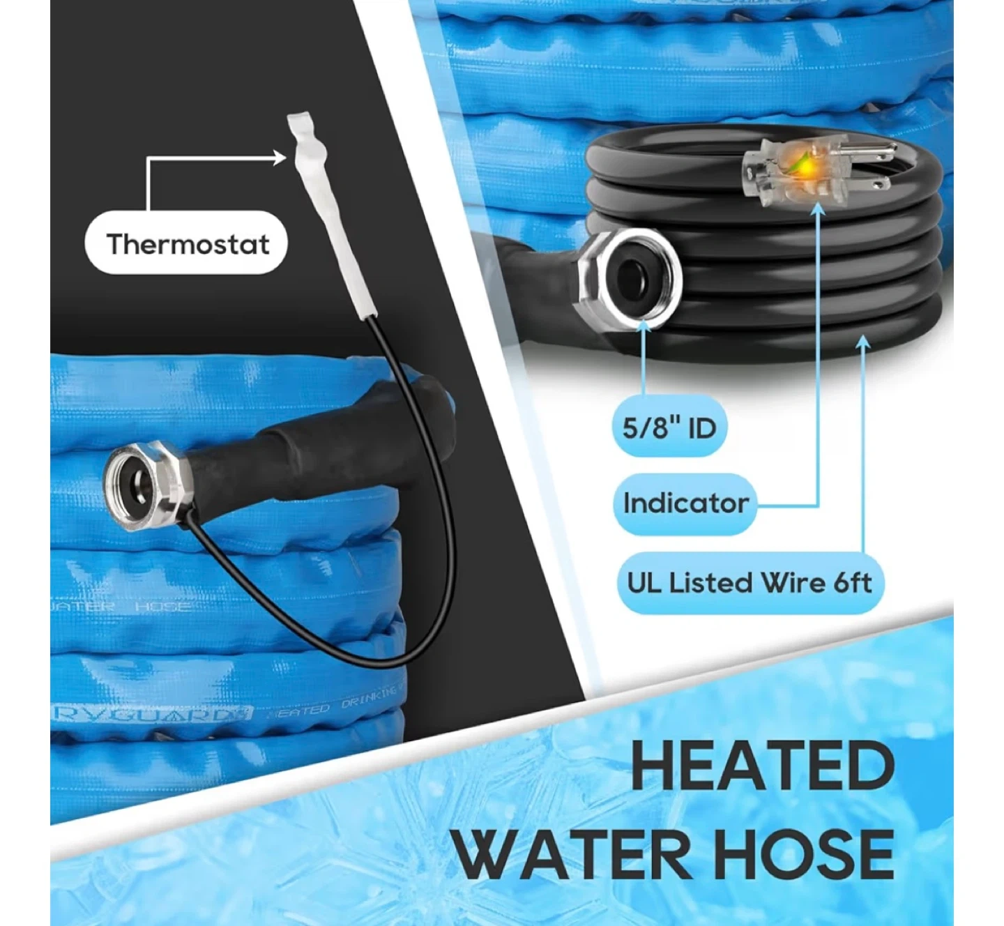 Keep your water flowing all winter long with this Rygard heated drinking water hose! It provides freeze protection down to -20°F. The hose features a 5-layer material construction with a chemical fibre PVC coating, heating cable, PVC hose, Dacron, and high elastic PVC. It also has a temperature sensor that turns on at 47°F and off at 60°F, so you can be sure your water is always at the perfect temperature