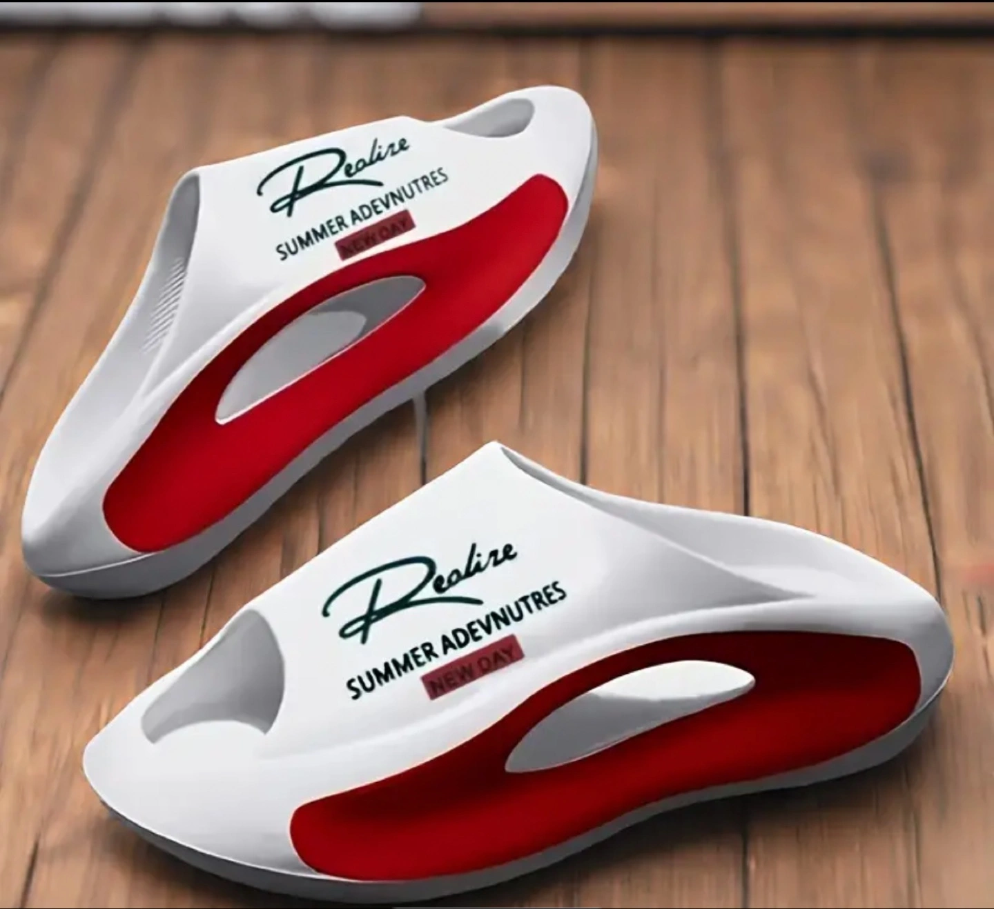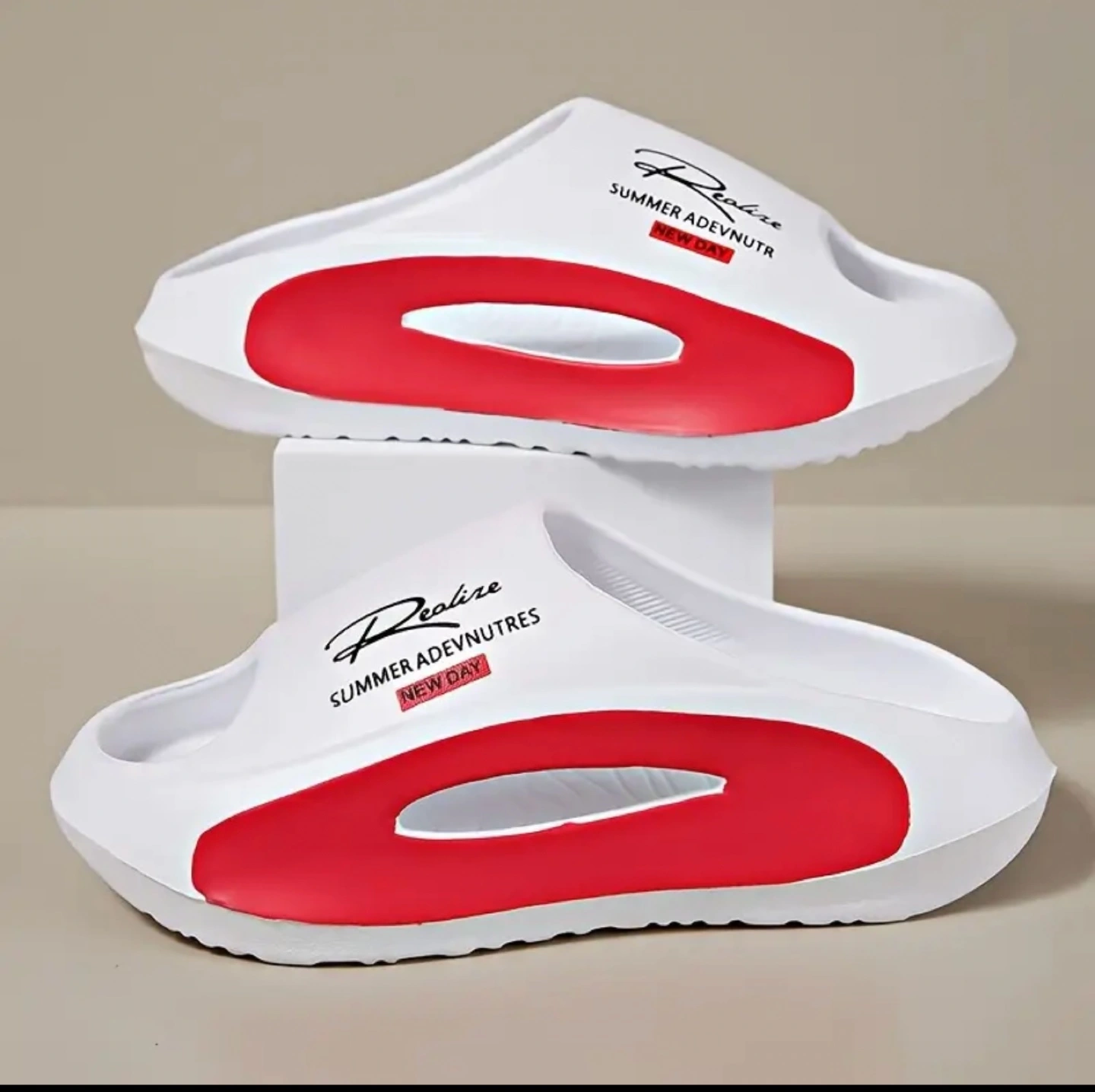 White and red slides. Comfortable footwear. Perfect for summer. Text on slides reads 'Rolize Summer Adevnntures New Day'.