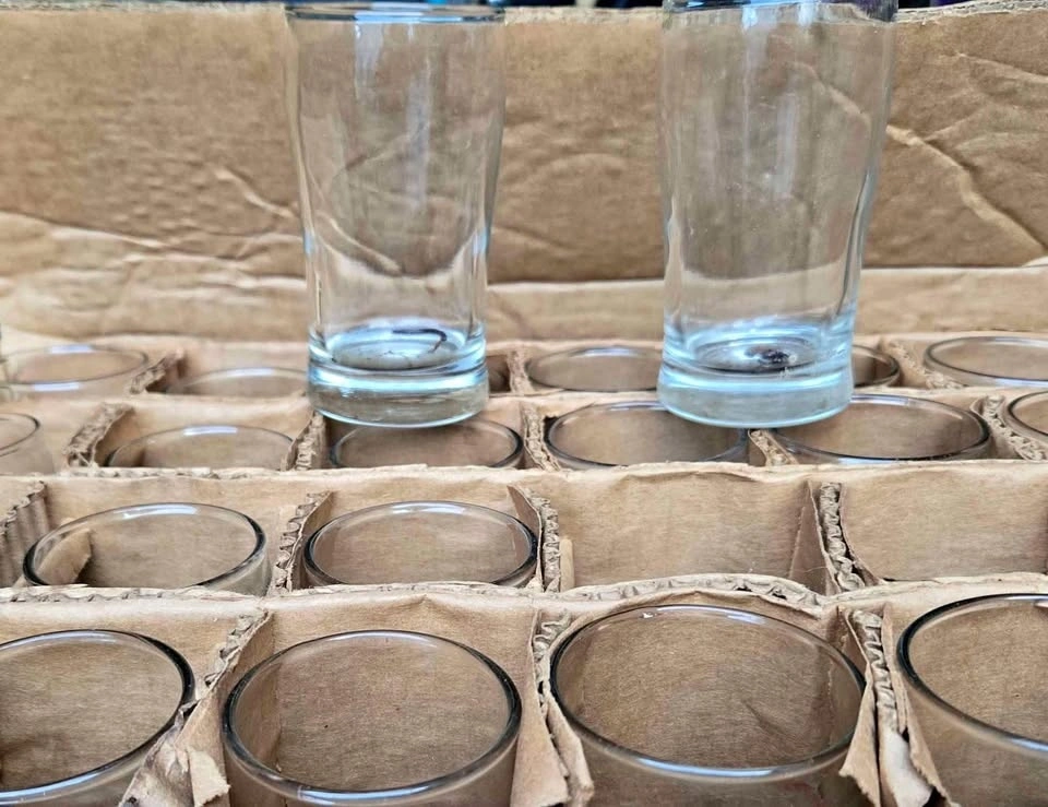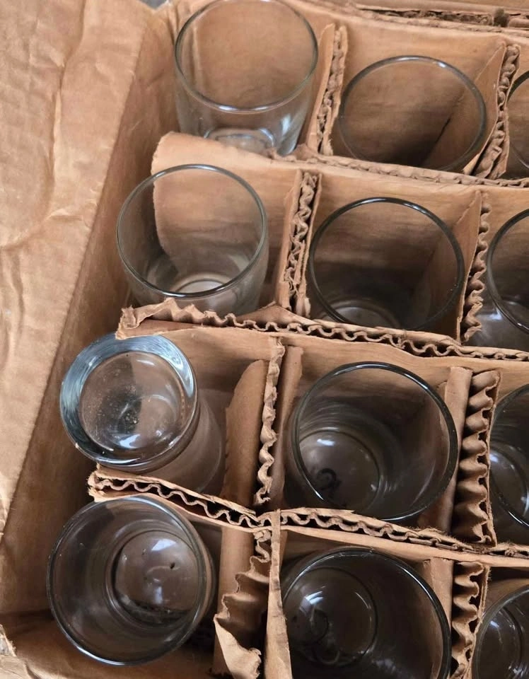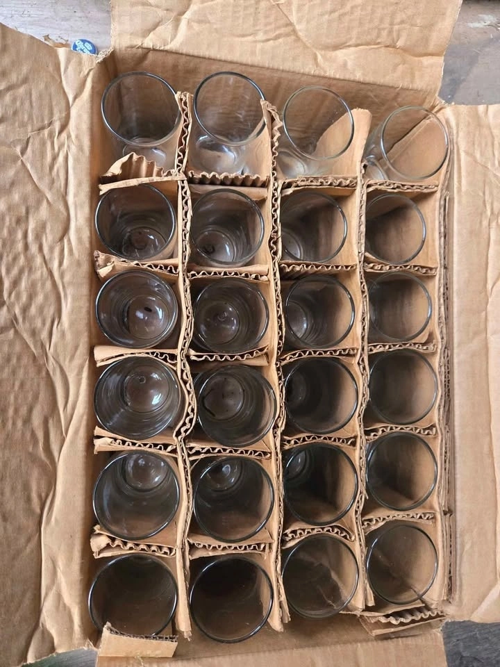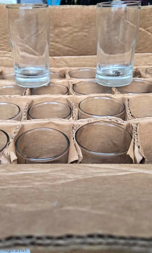 Box of 48 shot glasses. Not sure of the brand but glasses are solid and heavy for their size. In very good condition though they have a bit of dirt from storage. Great for a wedding, big party or for a restaurant or bar.