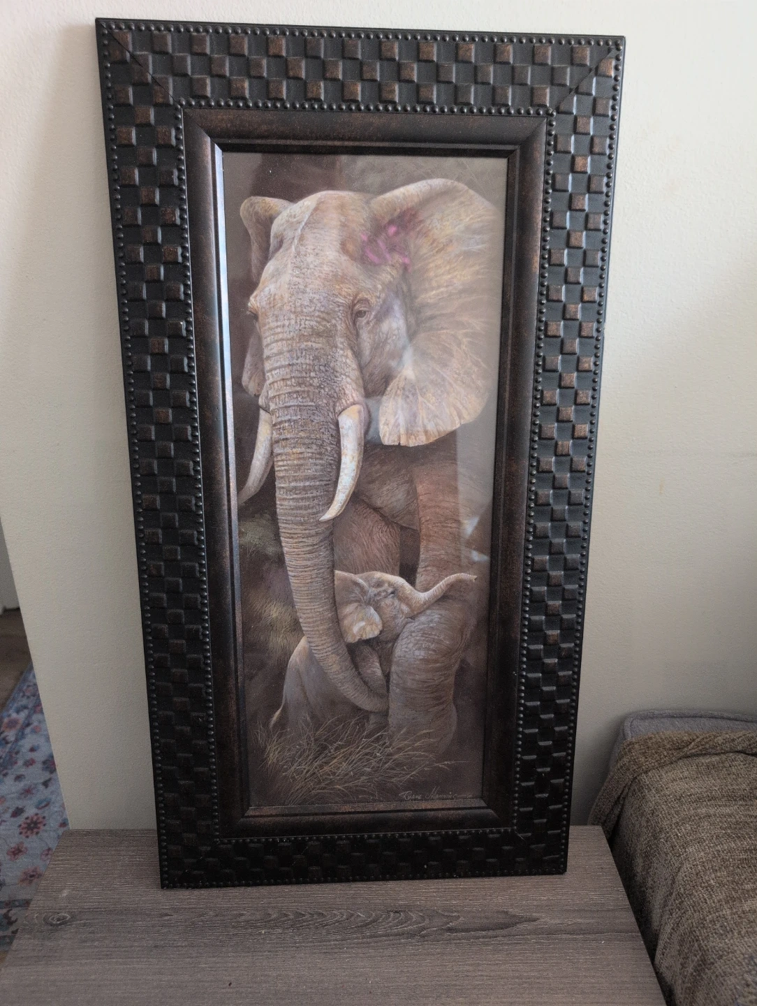 This set includes two framed prints: one featuring elephants and another with a giraffe and zebra. The frames have a dark, textured finish. They're ready to add a touch of nature to your decor.