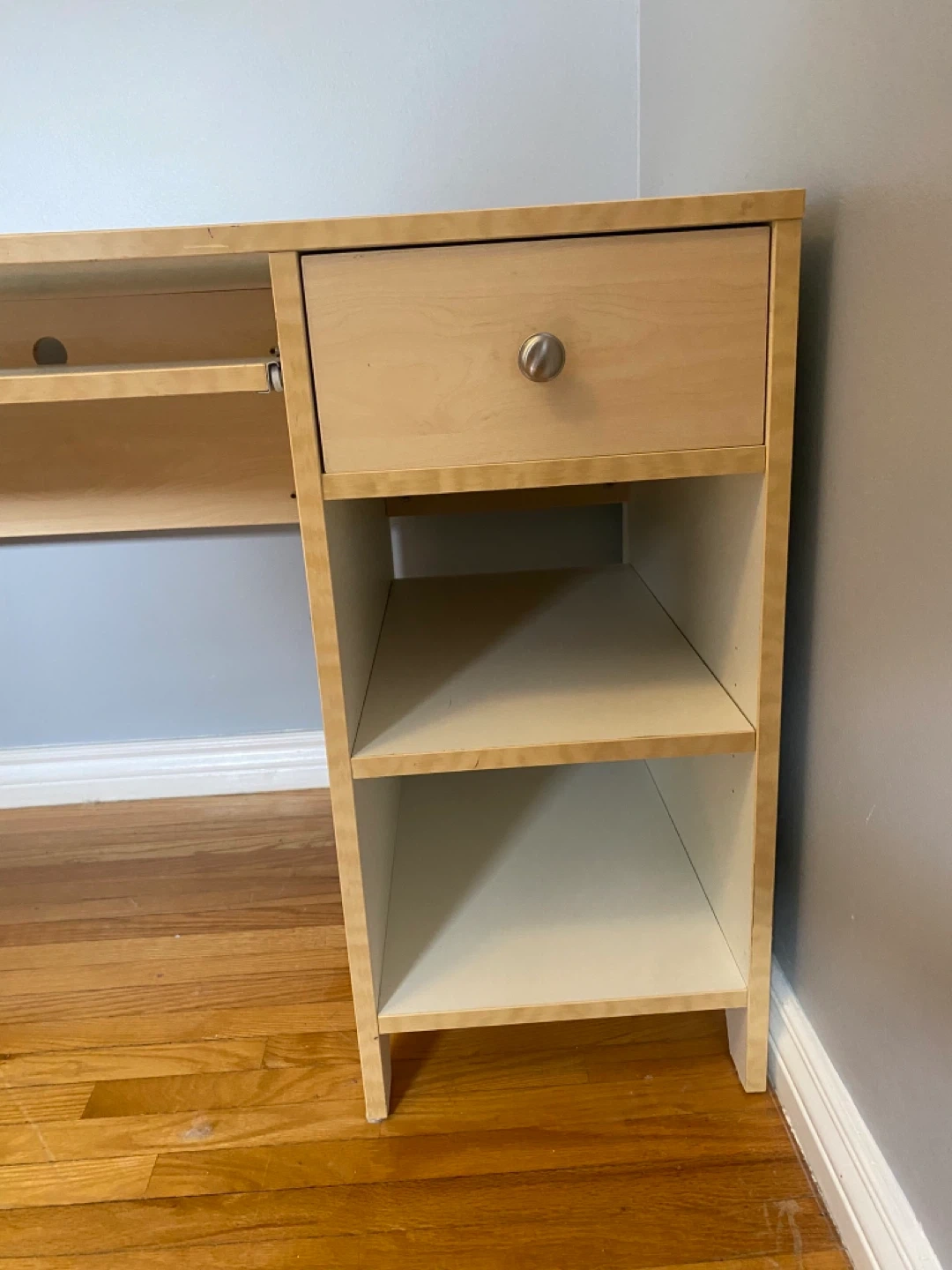 This desk features a pull-out keyboard tray and a single drawer for storage. It also includes two open shelves built into the side unit. It's made of a light-coloured wood composite. Some minor imperfections on desk.