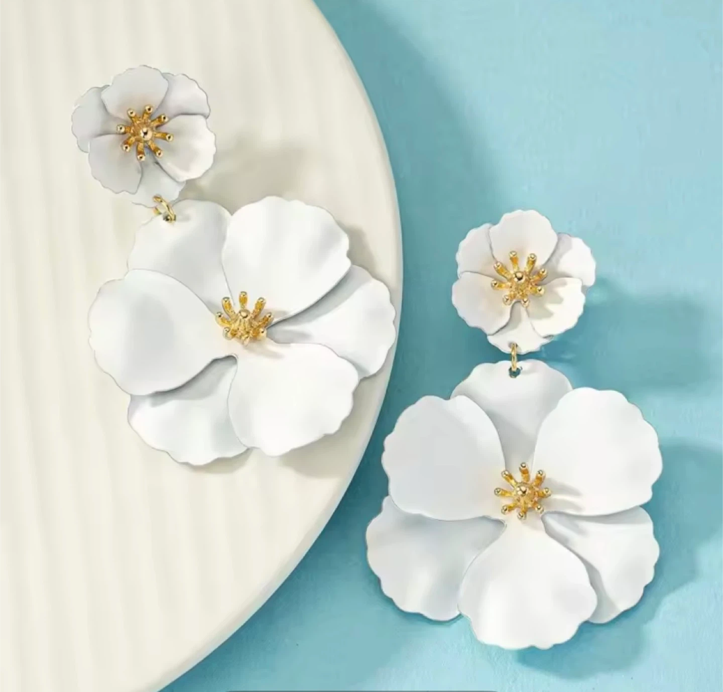These are some really cute flower drop earrings! They're perfect for adding a pop of fun to any outfit. The earrings have a drop of 6.6cm and a width of 4.2cm.