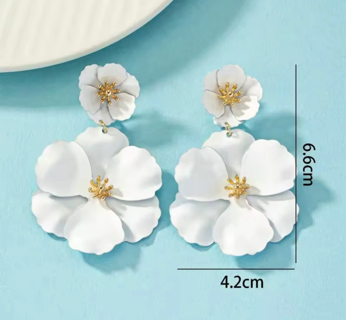 These are some really cute flower drop earrings! They're perfect for adding a pop of fun to any outfit. The earrings have a drop of 6.6cm and a width of 4.2cm.