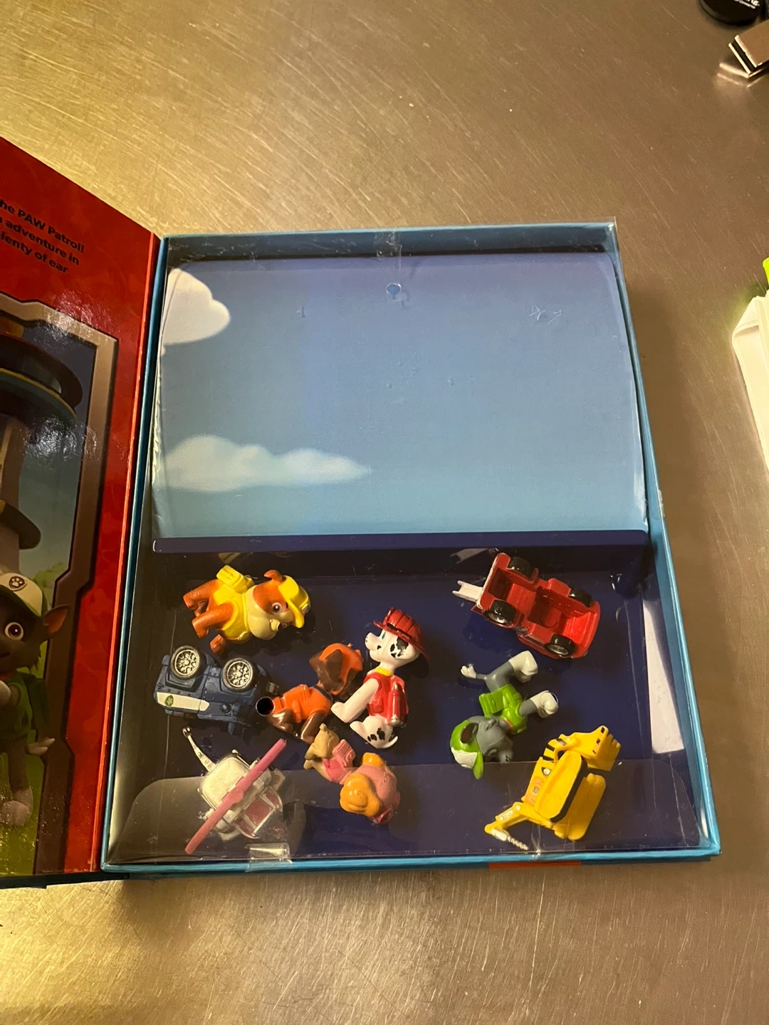 This Paw Patrol My Busy Books activity set includes a storybook, 10 figurines (missing one character) and a playmat.