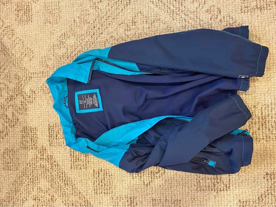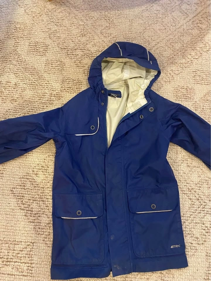 All rain jackets with no holes and still waterproof. North Face flower print rain jacket size 10 (fits small) - EUC $15 - SOLD. MEC Red size 8 - EUC $15. MEC blue size 8 - GUC $5. SNO leaf print size 10 - $15: warm and cozy, water resistant, not stellar waterproofing but very warm. Paradox purple size 10-12: GUC $5. Gap windbreaker blue - $10: EUC (barely worn) lightweight water resistant SOLD. Lynn valley porch pick up.