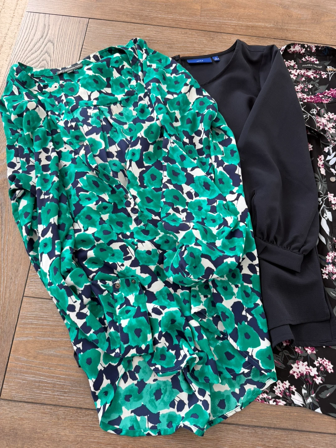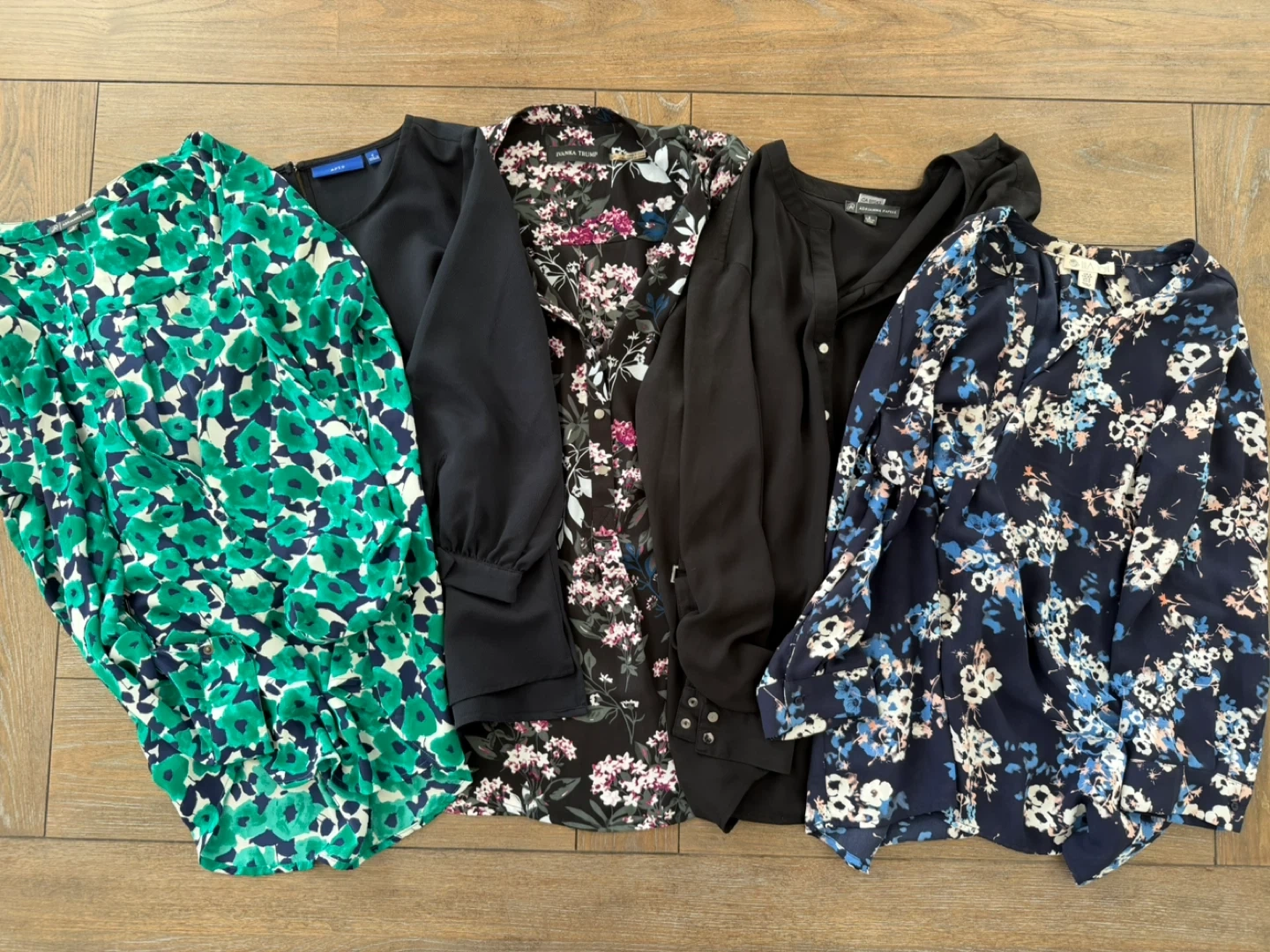 A collection of five women's blouses featuring various floral and solid patterns. Includes a green floral, two black floral, a solid black, and a navy floral blouse. They're suitable for work or casual wear.