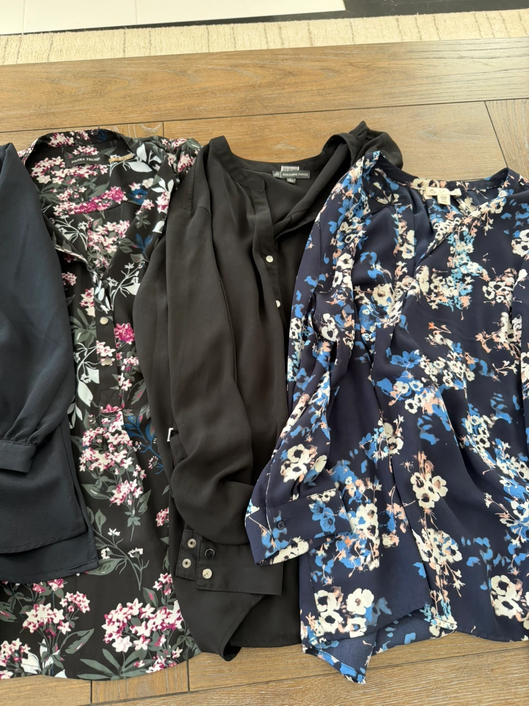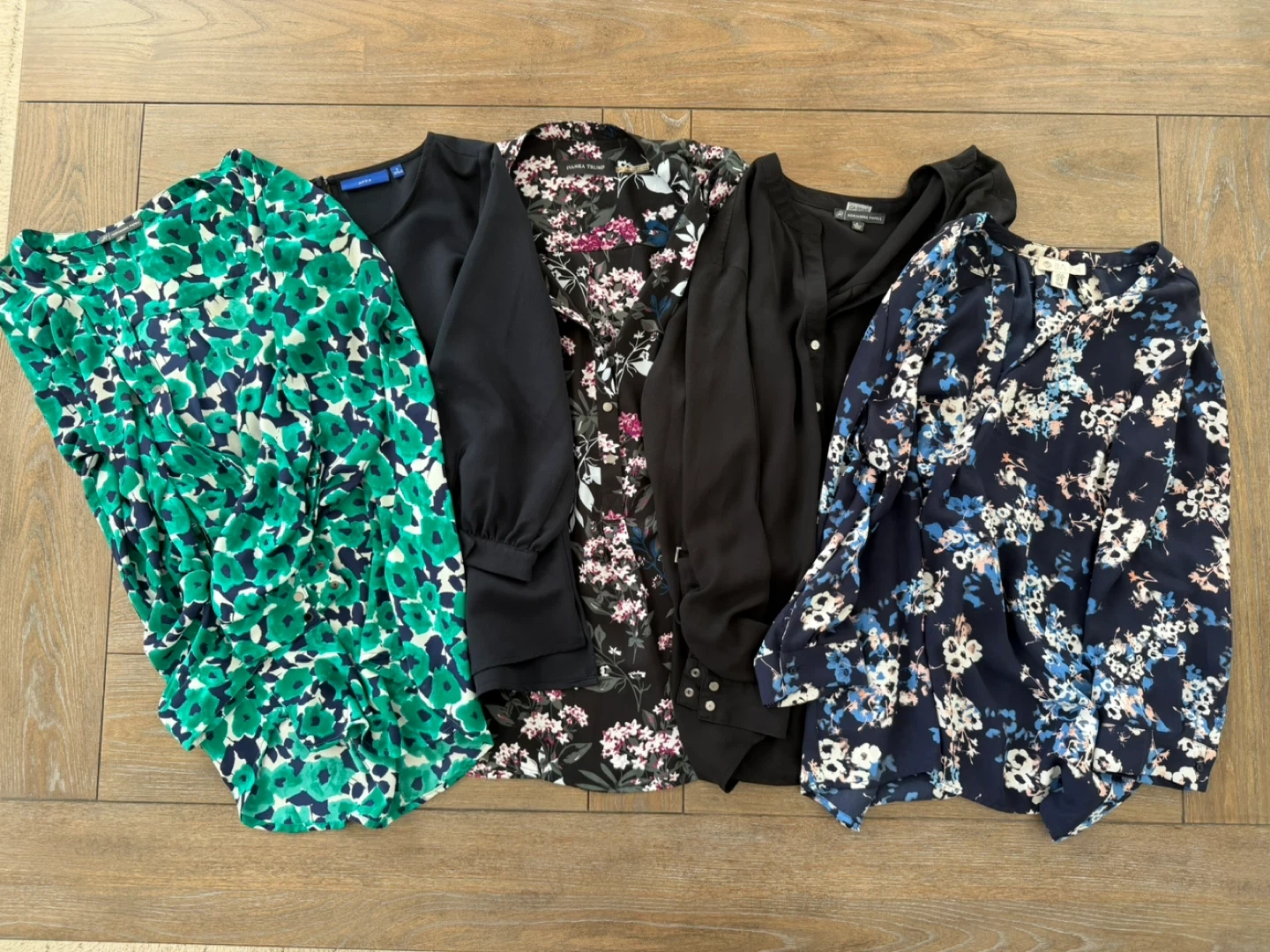 A collection of five women's blouses featuring various floral and solid patterns. Includes a green floral, two black floral, a solid black, and a navy floral blouse. They're suitable for work or casual wear.