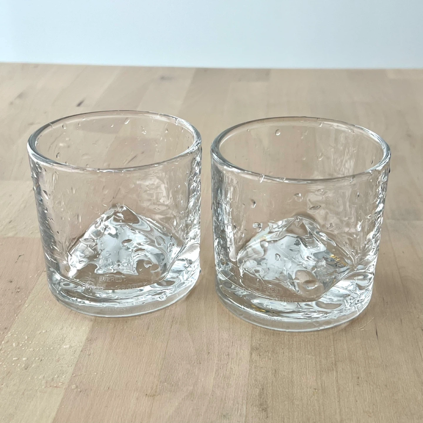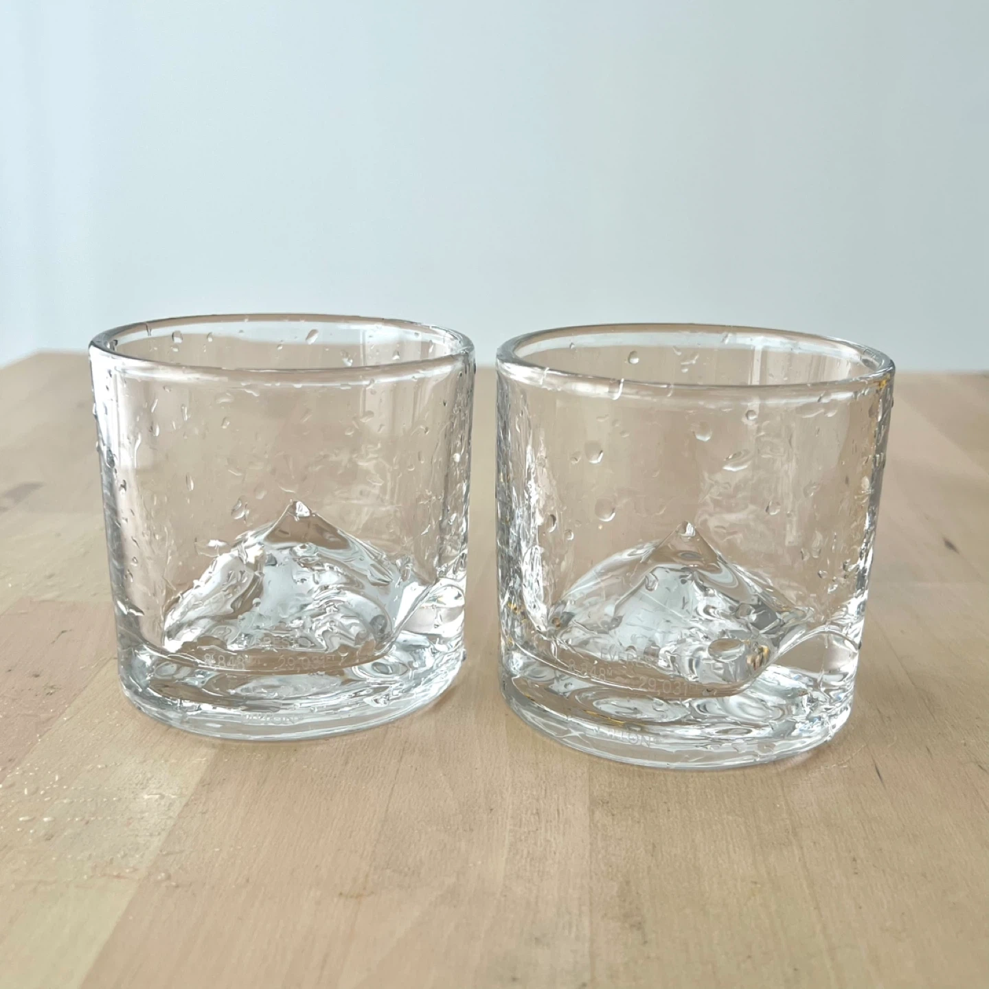 These unique whiskey glasses feature an embedded mountain design at the base. They're made of clear glass and come as a set of two.