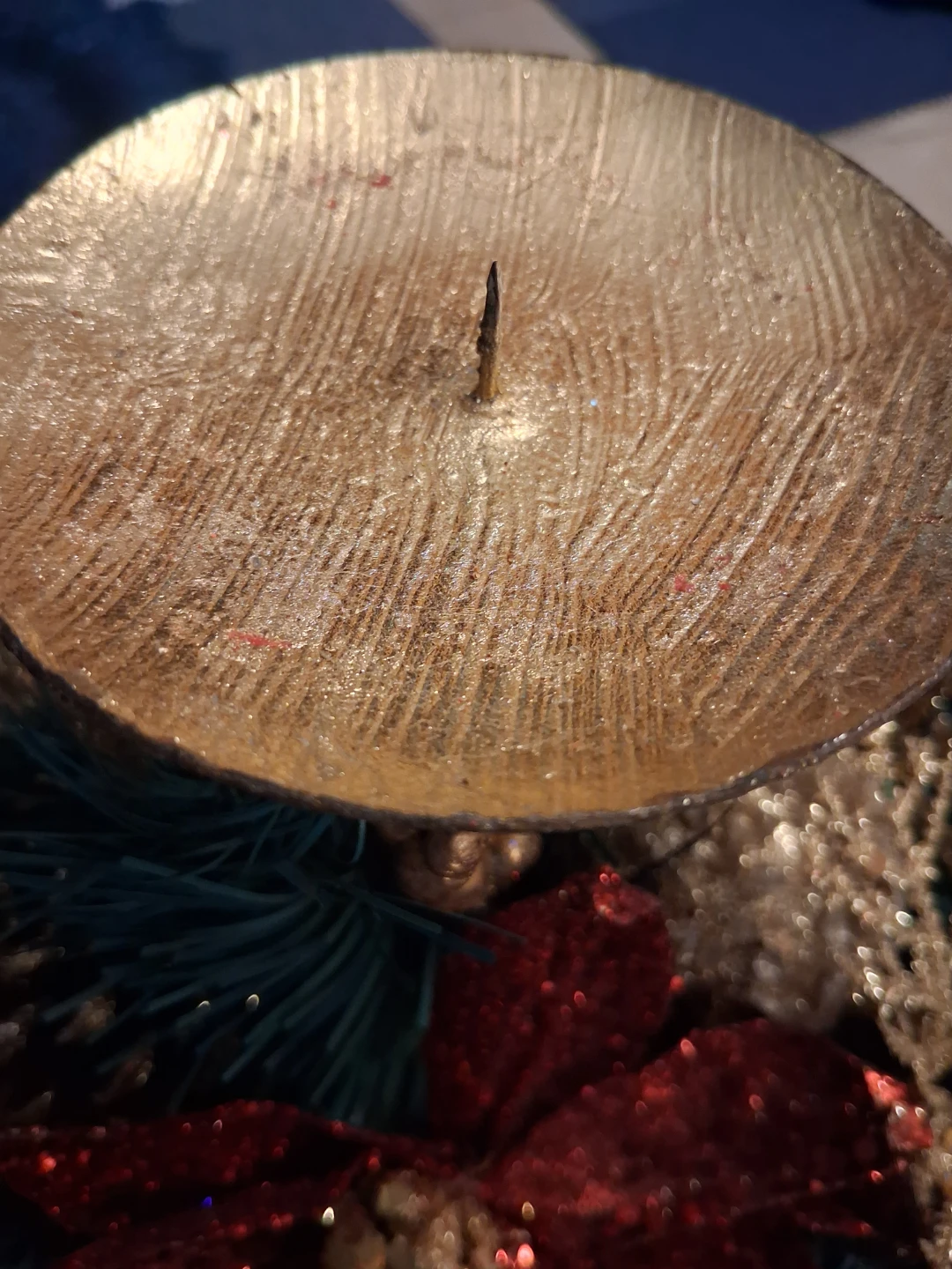 This is a beautiful holiday candle holder, perfect for adding a festive touch to your home decor! It features a red glittery poinsettia, gold accents, pine cones, and greenery. It's in great condition and ready to brighten up your space for the holidays