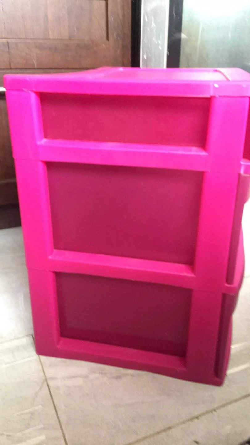 A bright pink plastic storage unit with three drawers. This compact organizer is great for small items. Plastic material.