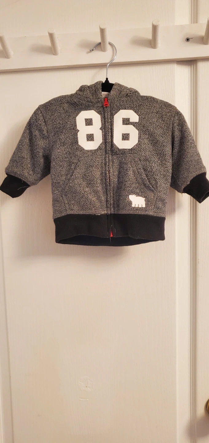 Here's an adorable little zip-up hoodie for your little one! It's grey with the number 86 on the front, and a cute bear logo near the bottom. It's in great condition and perfect for keeping your baby warm on cooler days. Size is 0-3 months