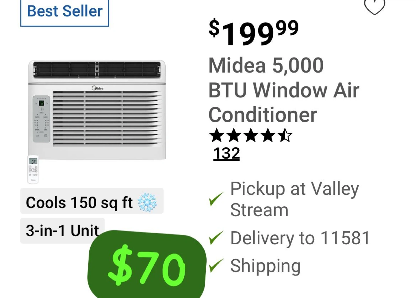 This Midea window air conditioner has 5,000 BTU cooling power and is a 3-in-1 unit. It's suitable for cooling spaces up to 150 sq ft. Includes a remote control.