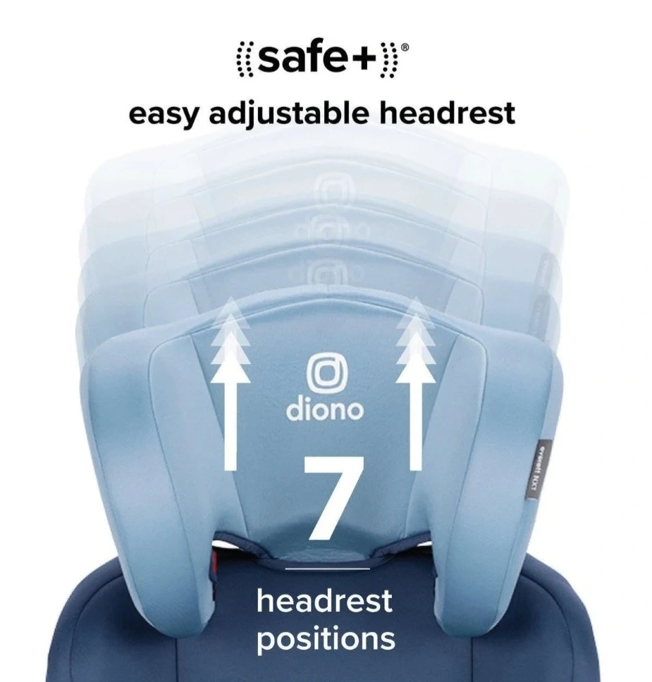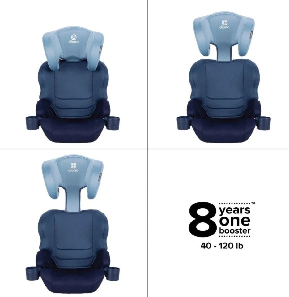 Diono booster car seat in blue with adjustable headrest. It's suitable for children 40-120 lbs and offers 7 headrest positions. Seat measures 16 inches wide and 27.5 inches high.
