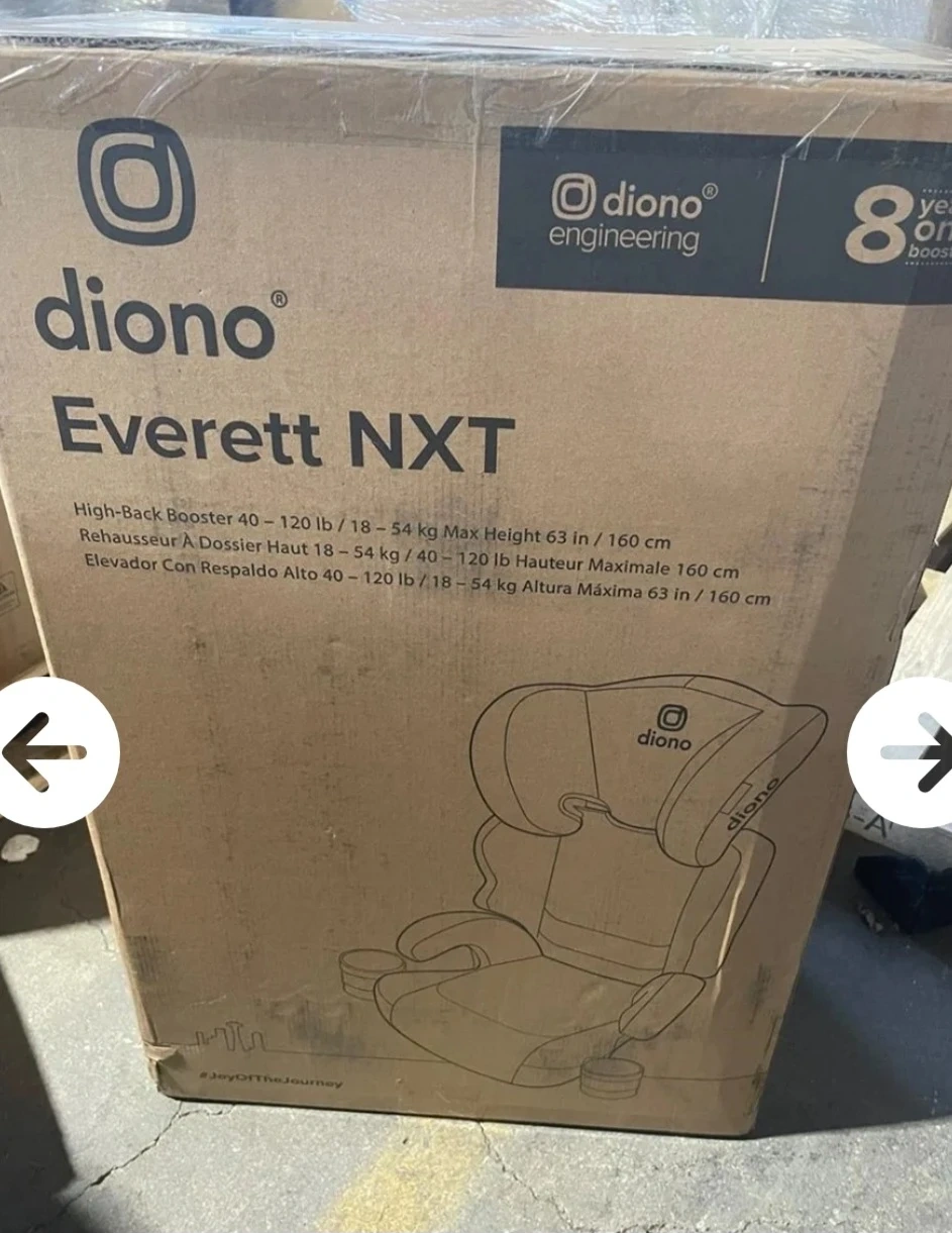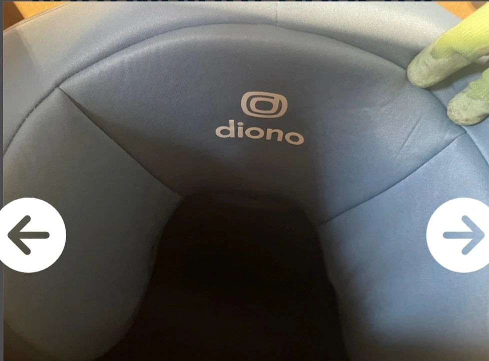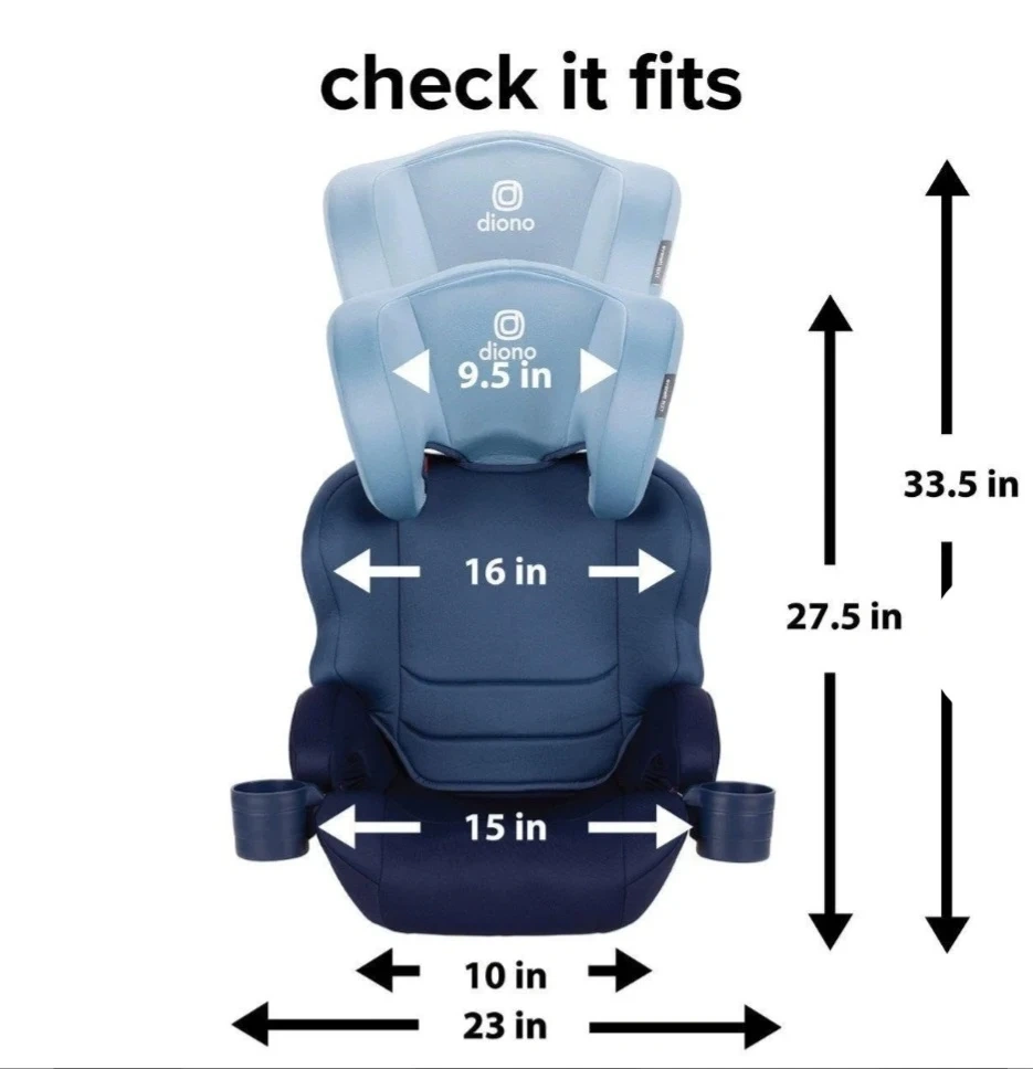 Diono booster car seat in blue with adjustable headrest. It's suitable for children 40-120 lbs and offers 7 headrest positions. Seat measures 16 inches wide and 27.5 inches high.
