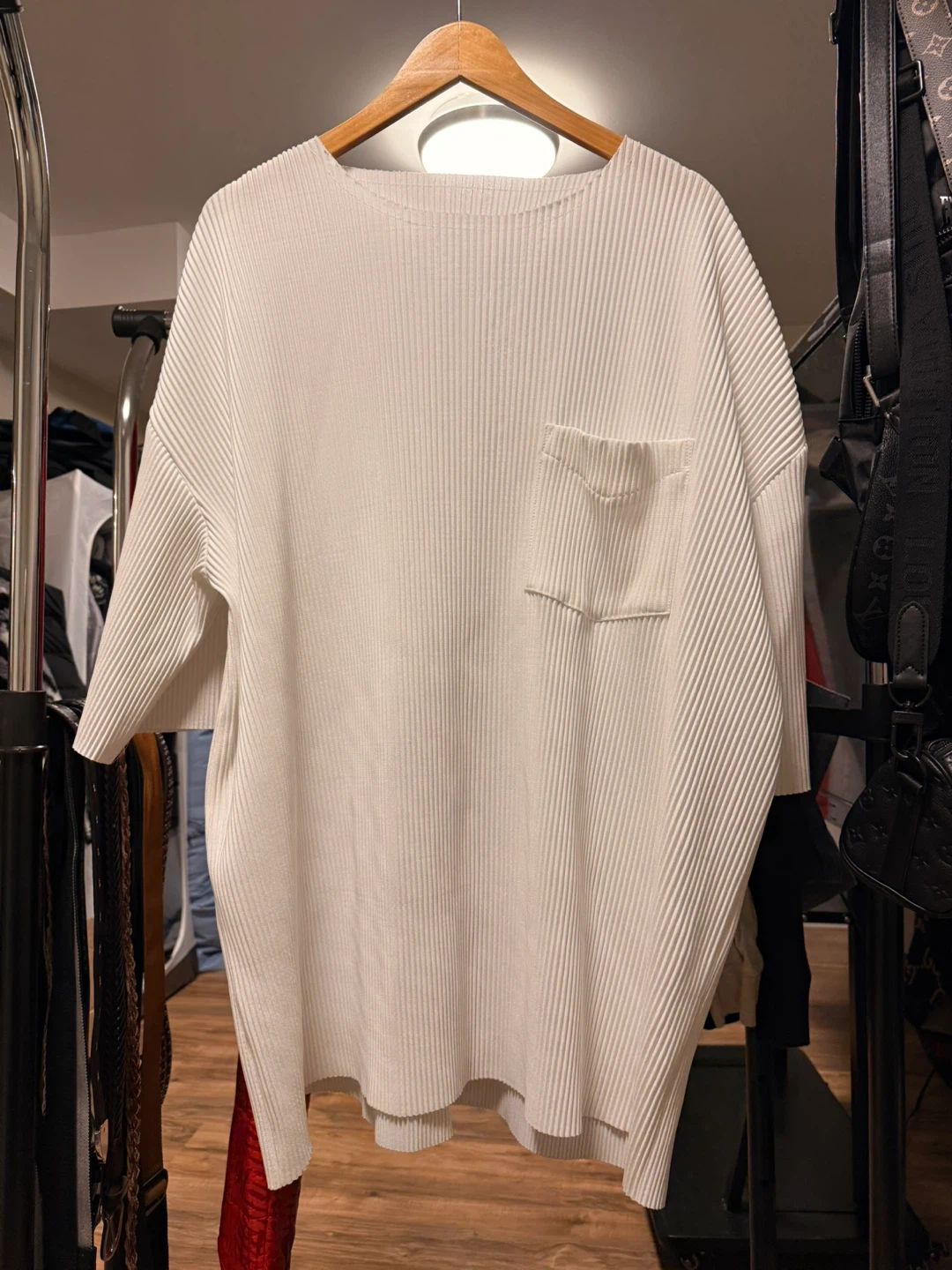 A white t-shirt with a distinctive pleated texture and a single chest pocket. It's made from a lightweight fabric. This top offers a relaxed fit for comfortable wear.