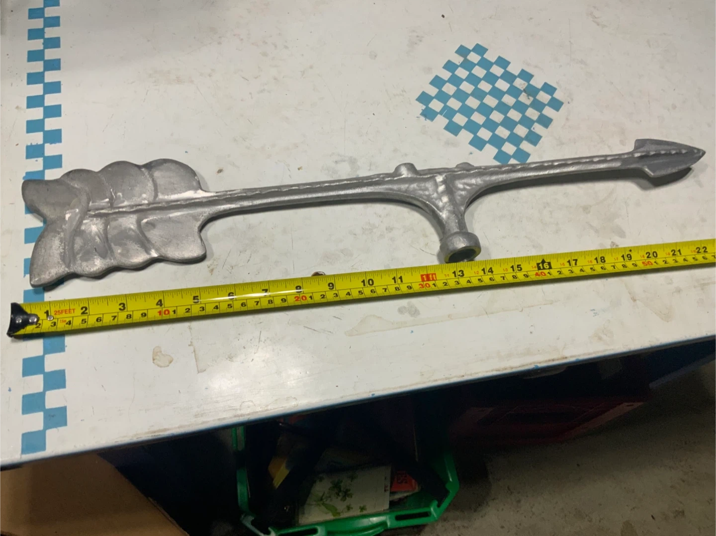 This is a silver-toned arrow weather vane. It's made of metal and measures approximately 22 inches in length. The front features an ornamental leaf design. It has a mounting hole for attachment.