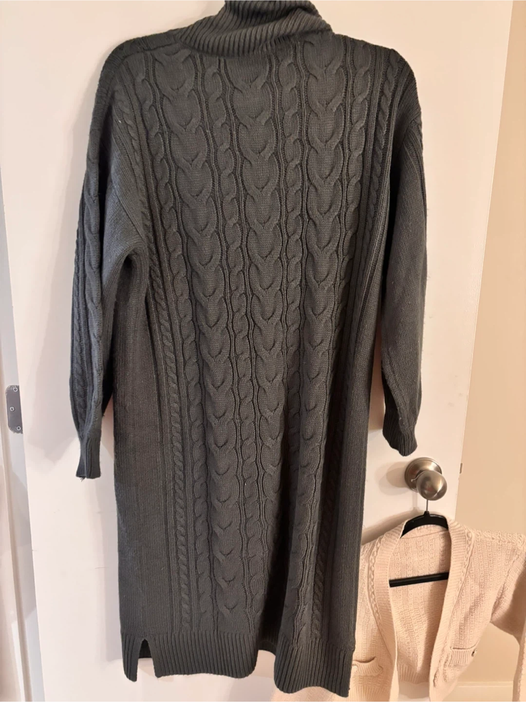 This turtleneck sweater dress features a classic cable knit pattern. It has a ribbed hem and cuffs for a snug fit. This dress is perfect for staying warm and stylish during cooler weather.