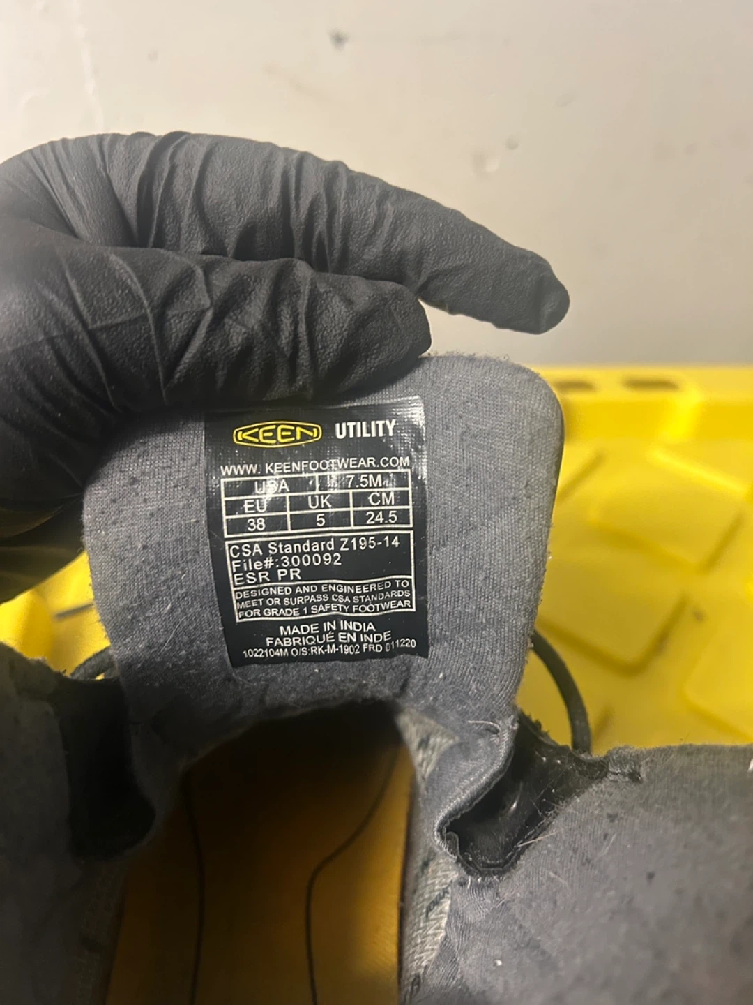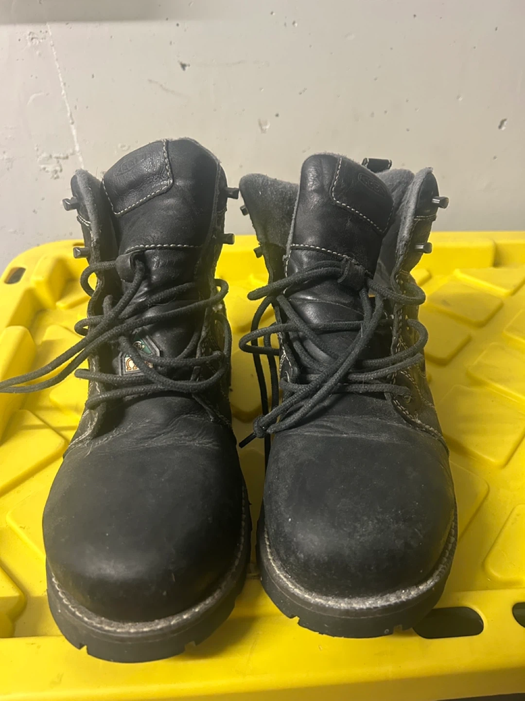 Keen Utility black leather work boots. Size 7.5M US / 5 UK / 38 EU / 24.5 CM. Features CSP Standard Z195-14 rating. Designed and engineered to meet or surpass CSA standards for grade 1 impact/electric shock footwear.