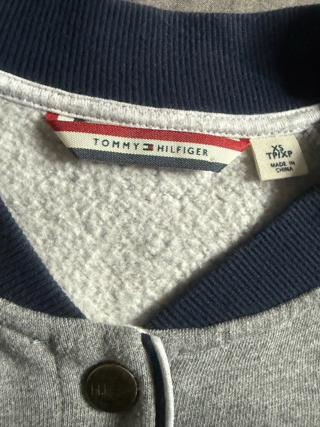This Tommy Hilfiger jacket is a stylish and comfortable piece, perfect for adding a sporty touch to any outfit. It features a grey body with contrasting sleeves and the iconic "H" logo patch on the chest. This item is in great condition.