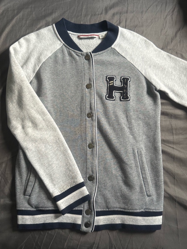 This Tommy Hilfiger jacket is a stylish and comfortable piece, perfect for adding a sporty touch to any outfit. It features a grey body with contrasting sleeves and the iconic "H" logo patch on the chest. This item is in great condition.