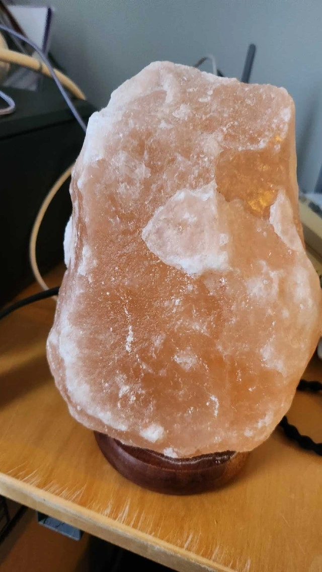 Selling a Himalayan salt lamp in used, but good condition. It's perfect for adding a warm and calming glow to any room. This lamp features a natural salt rock on a wooden base, with a dimmer switch for adjustable brightness.