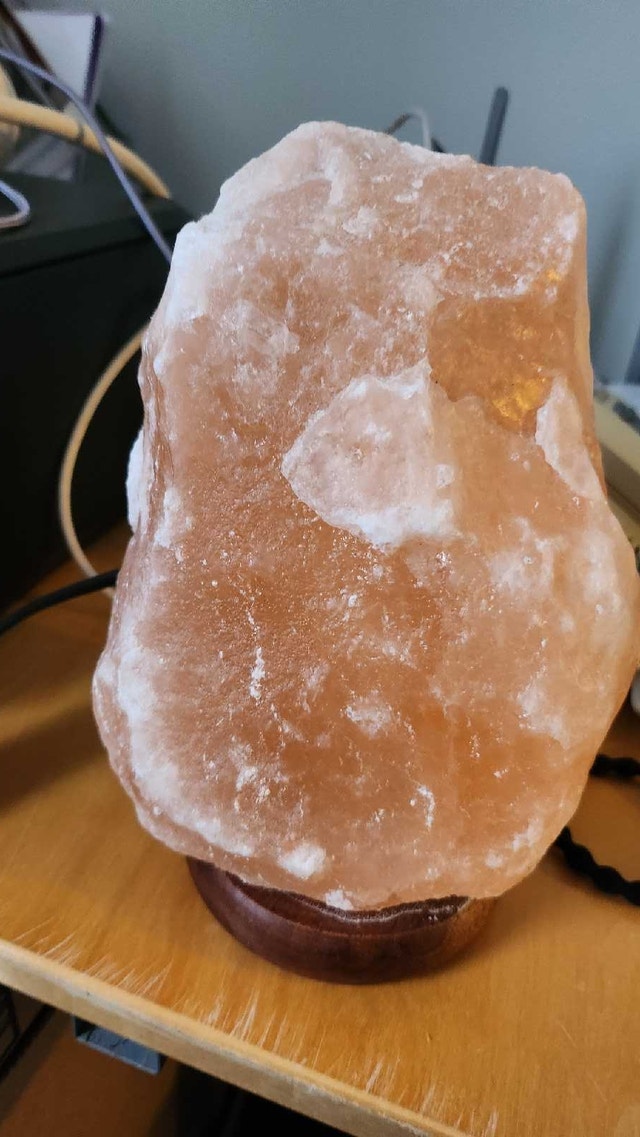 Selling a Himalayan salt lamp in used, but good condition. It's perfect for adding a warm and calming glow to any room. This lamp features a natural salt rock on a wooden base, with a dimmer switch for adjustable brightness.