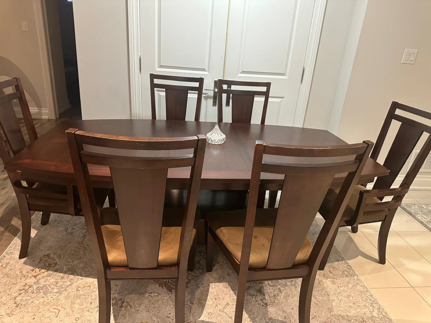 Selling a dining table along with six chairs. It's a lovely set with a rich brown wood finish. The chairs have cushioned seats for extra comfort. Perfect for family dinners or entertaining guests!