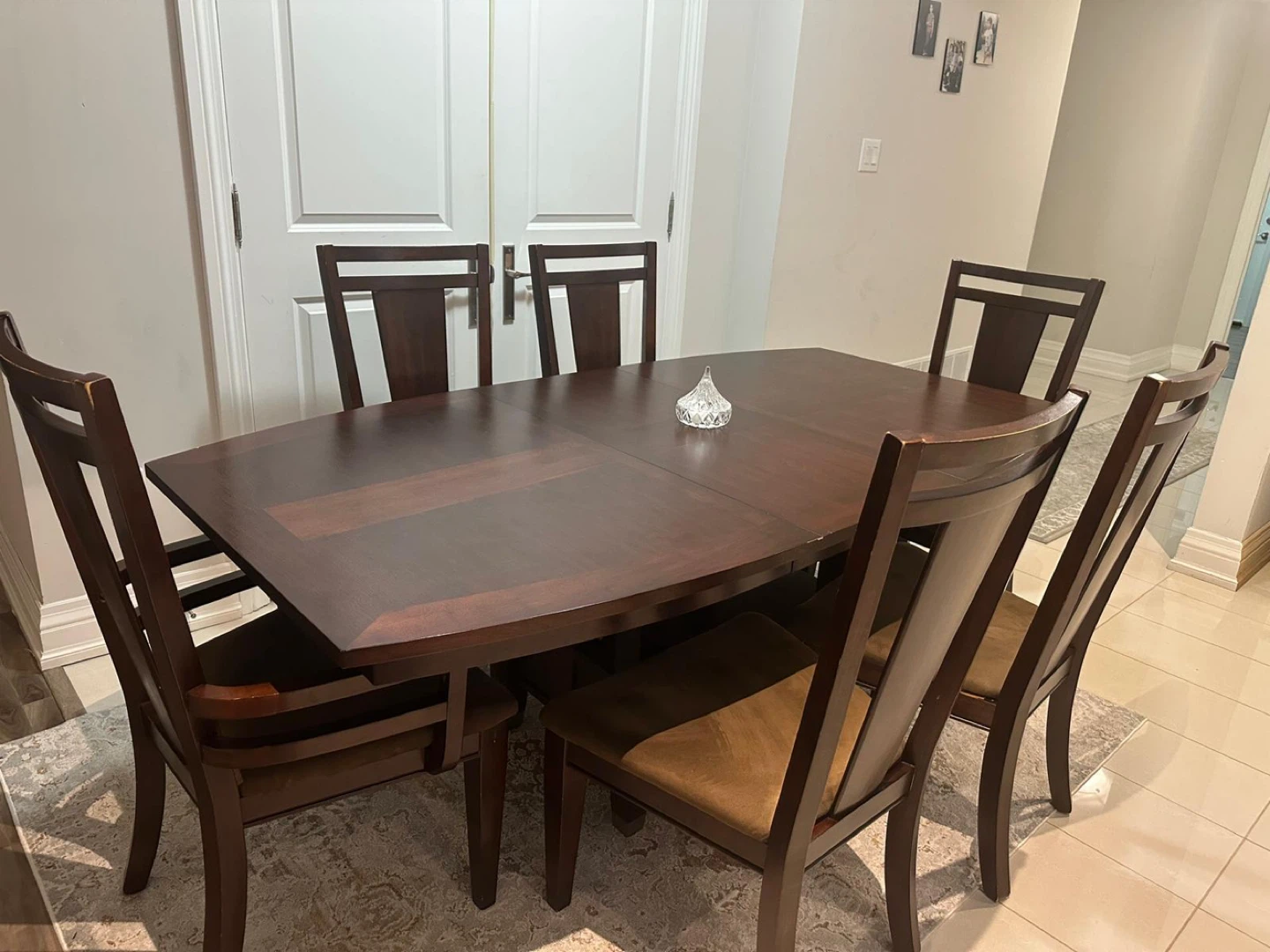 Selling a dining table along with six chairs. It's a lovely set with a rich brown wood finish. The chairs have cushioned seats for extra comfort. Perfect for family dinners or entertaining guests!