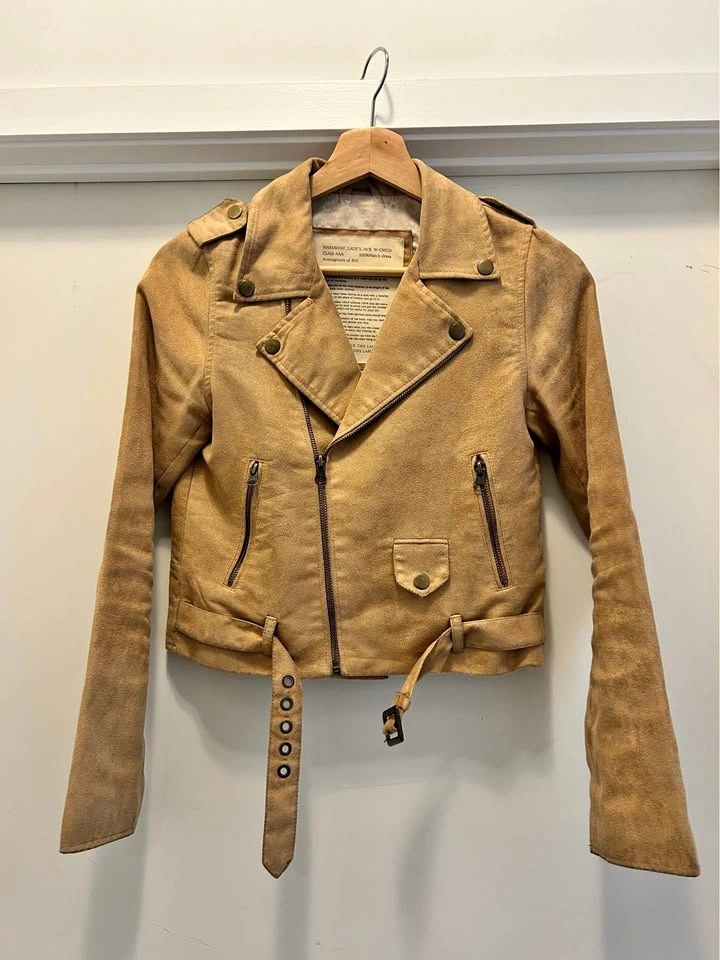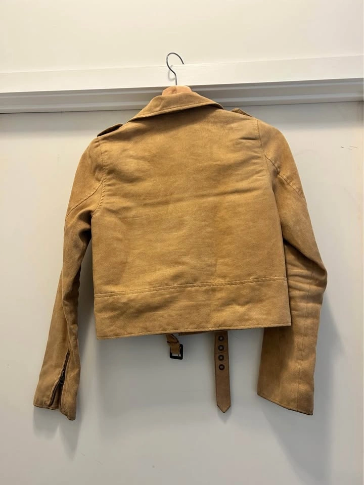 Tan suede jacket with a zip-up front, button details, and a belt. It has two zip pockets on the front and a button pocket on the right side. The cuffs have zippers. The jacket is cropped and has a collar.