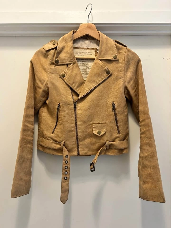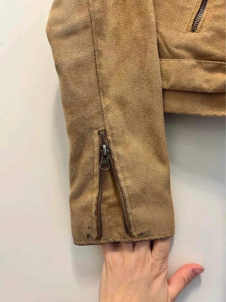 Tan suede jacket with a zip-up front, button details, and a belt. It has two zip pockets on the front and a button pocket on the right side. The cuffs have zippers. The jacket is cropped and has a collar.