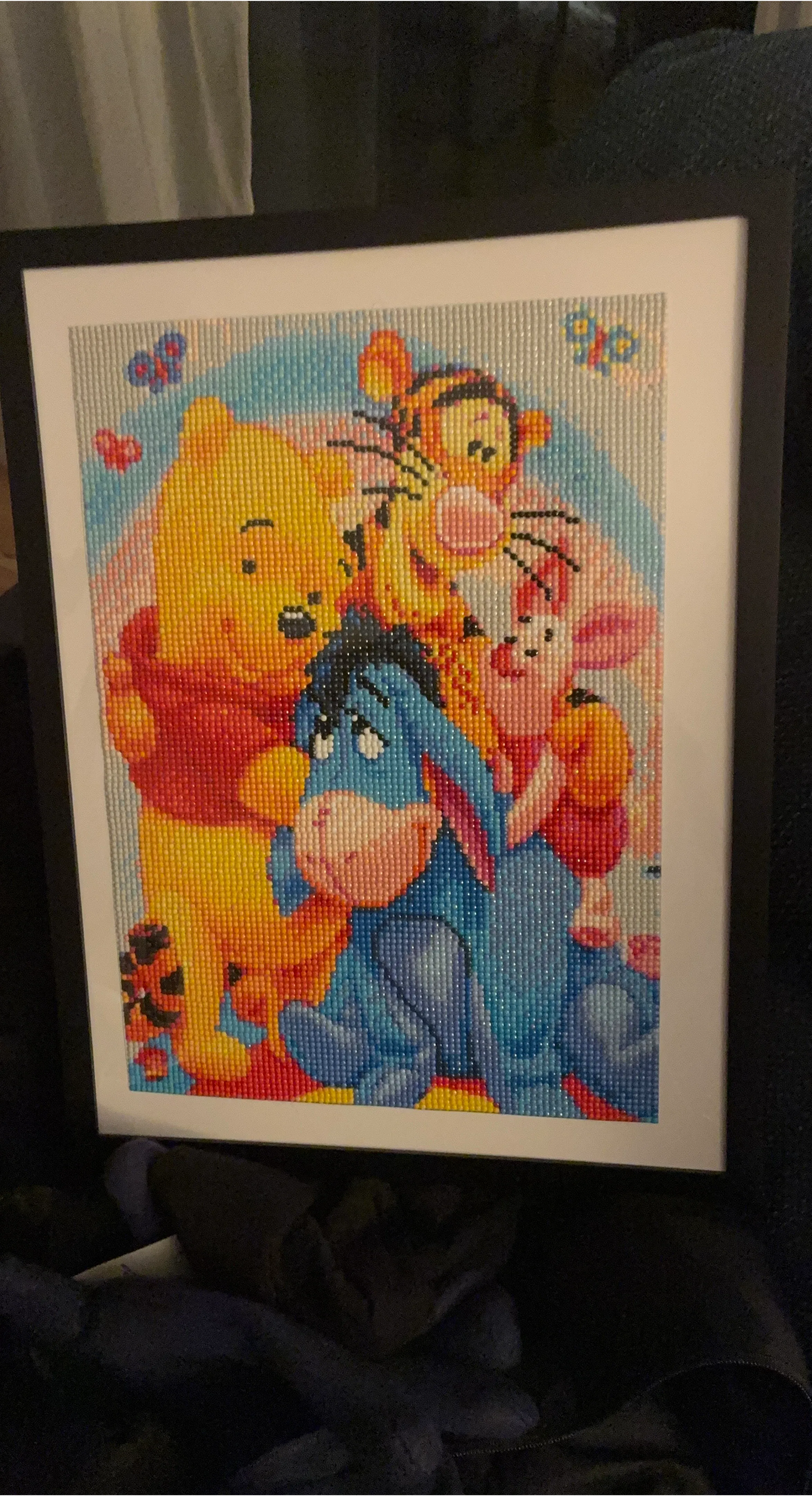 Finished diamond painting featuring Winnie the Pooh, Tigger, Piglet, and Eeyore. This framed artwork has a colorful design perfect for a nursery or fan's room! It's a delightful piece for any Disney enthusiast.