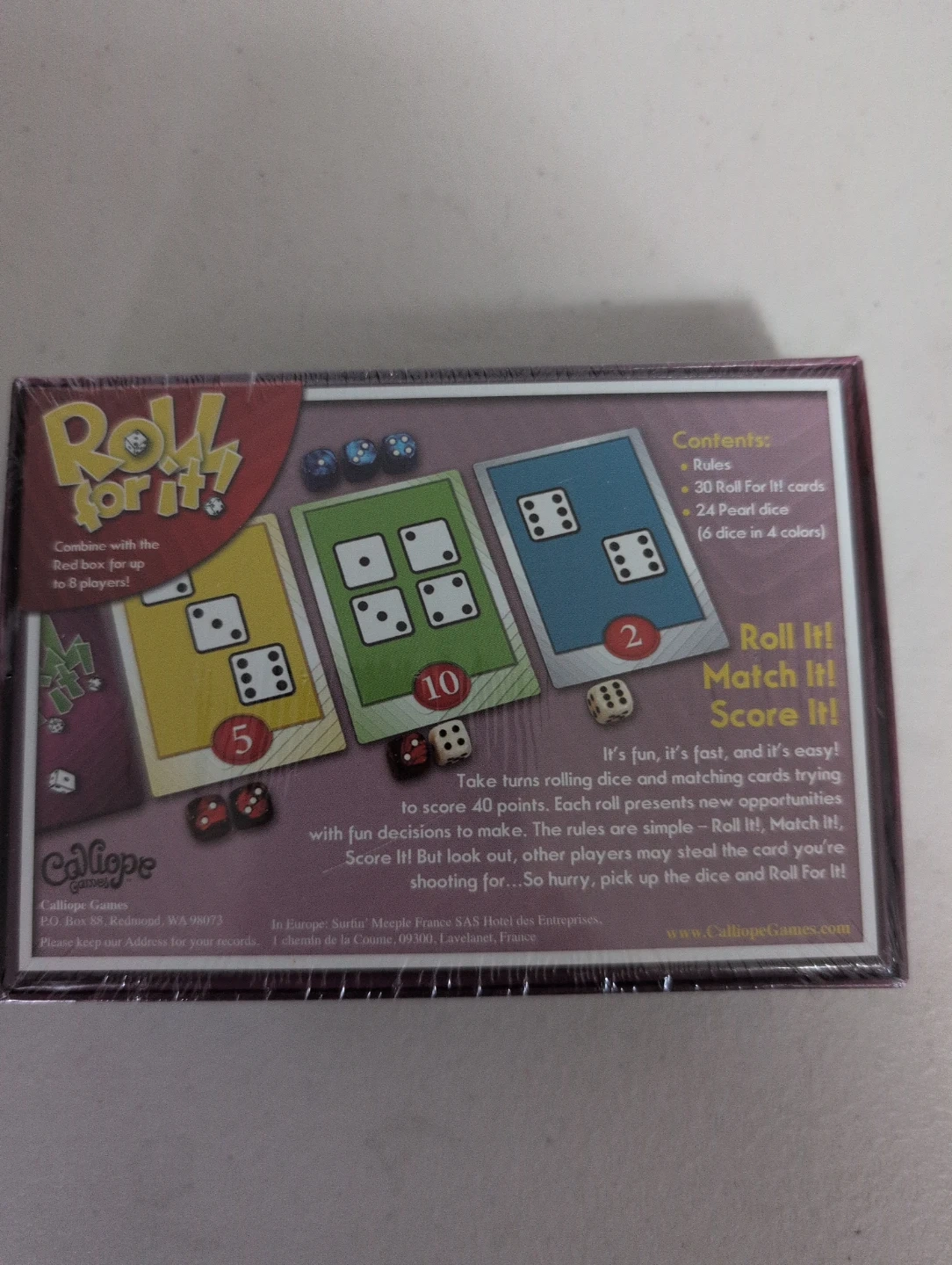 This is the Roll For It! Match It! Score It! game by Chris Leder. It includes 30 Roll For It! cards and 24 pearl dice in 4 colours. It's fun, fast, and easy to play!