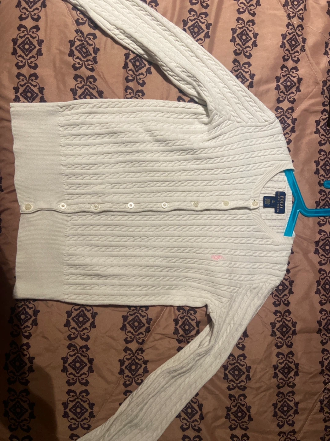 This is a white cable knit cardigan from Polo Ralph Lauren. It features a button-up front and long sleeves. It's made with a soft knit material.