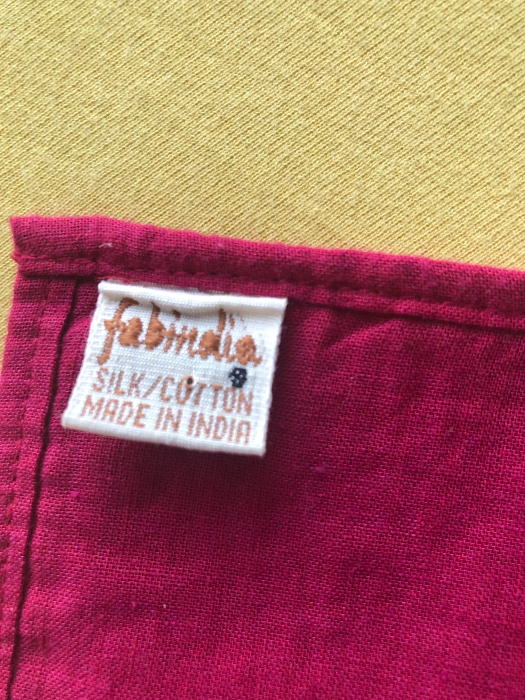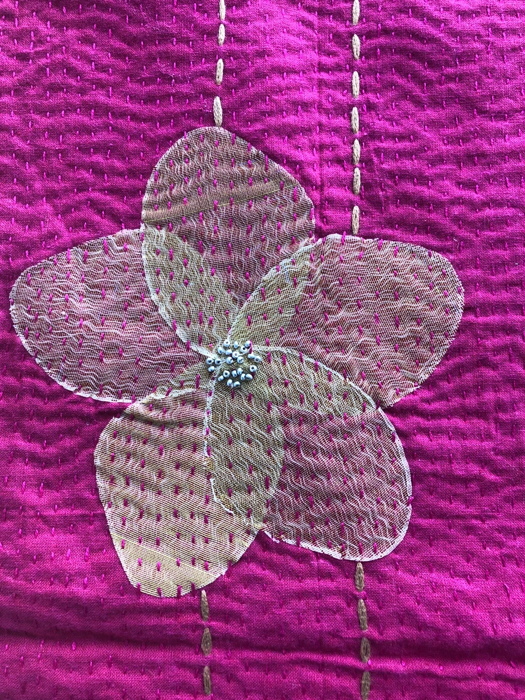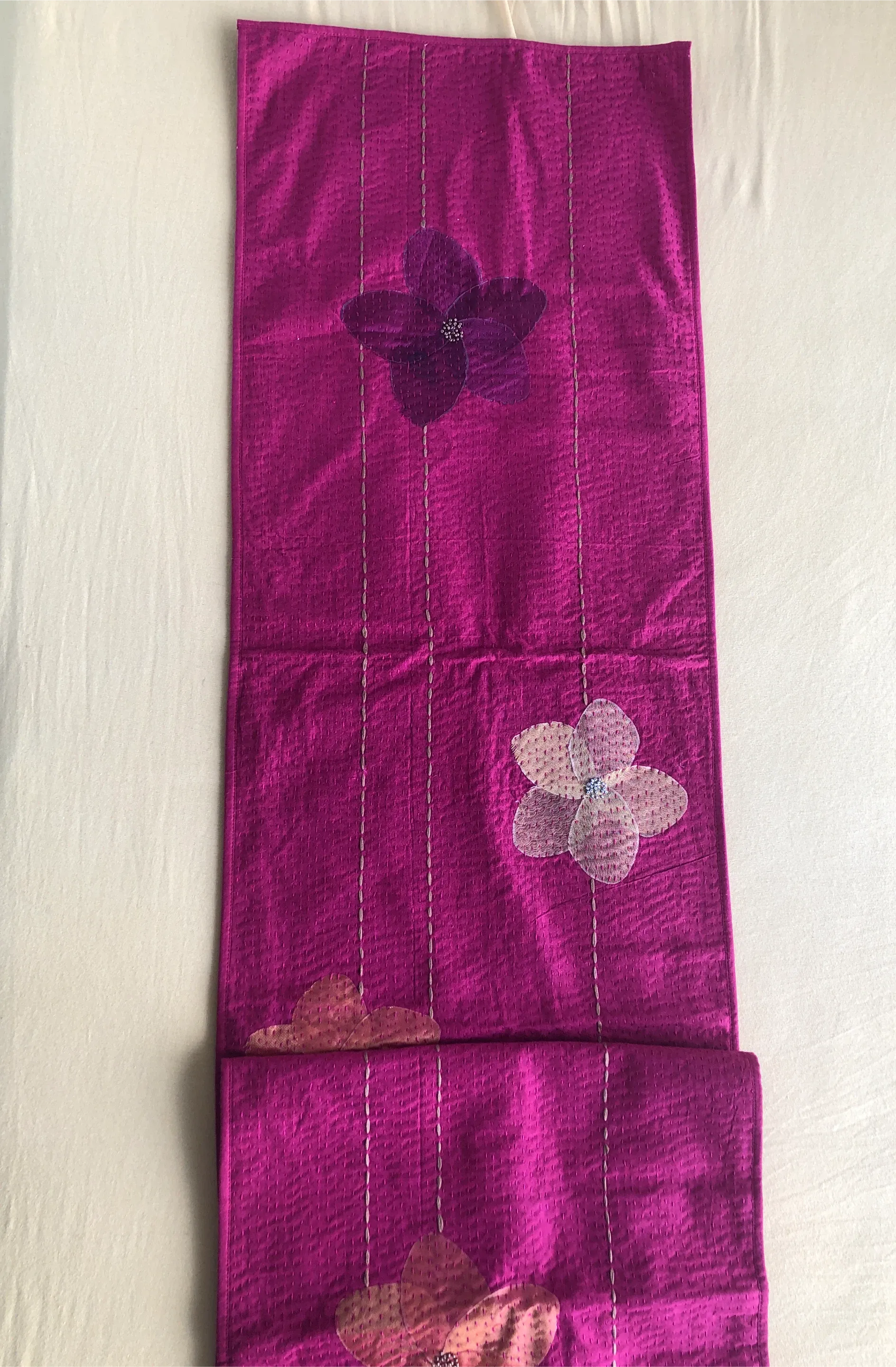 This vibrant pink table runner features embroidered floral appliques and textured fabric. It's made from a silk and cotton blend, offering a lovely drape. Perfect for adding a decorative touch to your dining table!