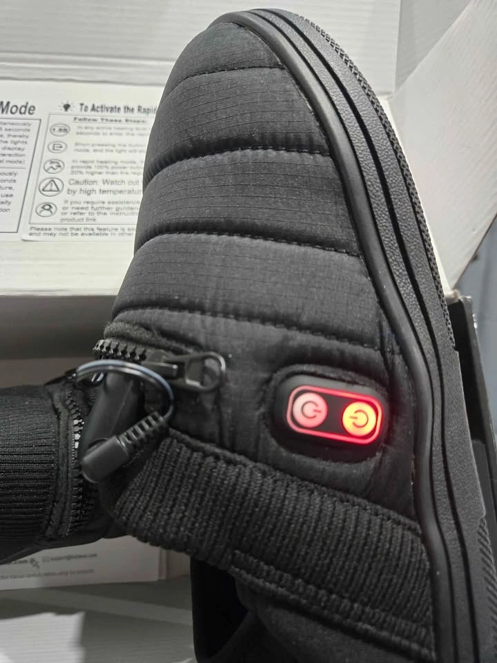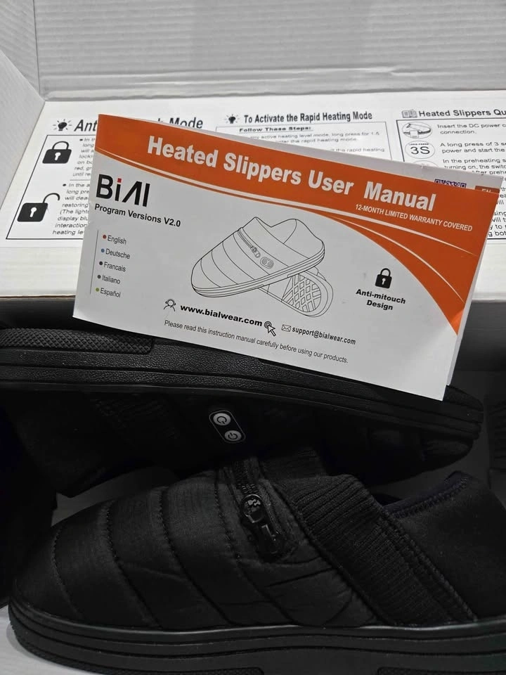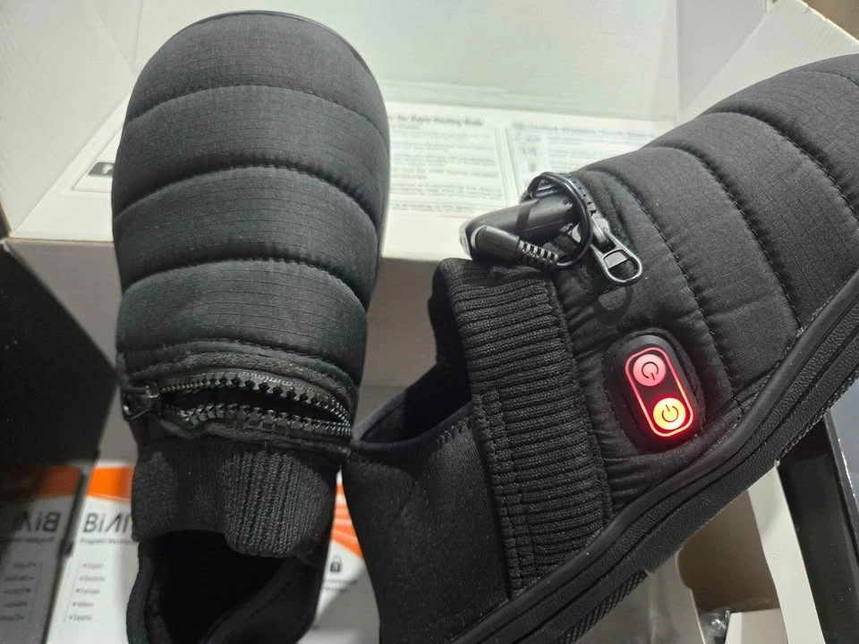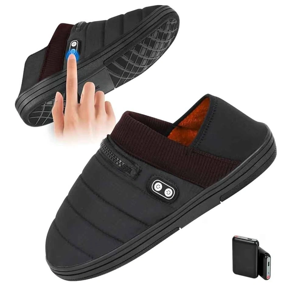 Warm and cozy heated slippers for cold weather. Rechargeable battery powered for cordless heat. Suitable for men and women with cold feet. Great for camping or around the house. Small size.