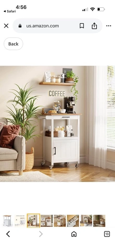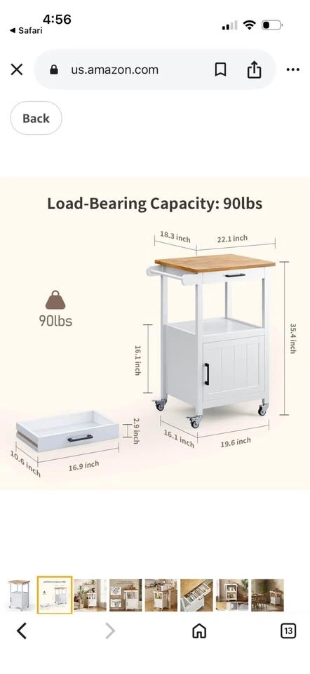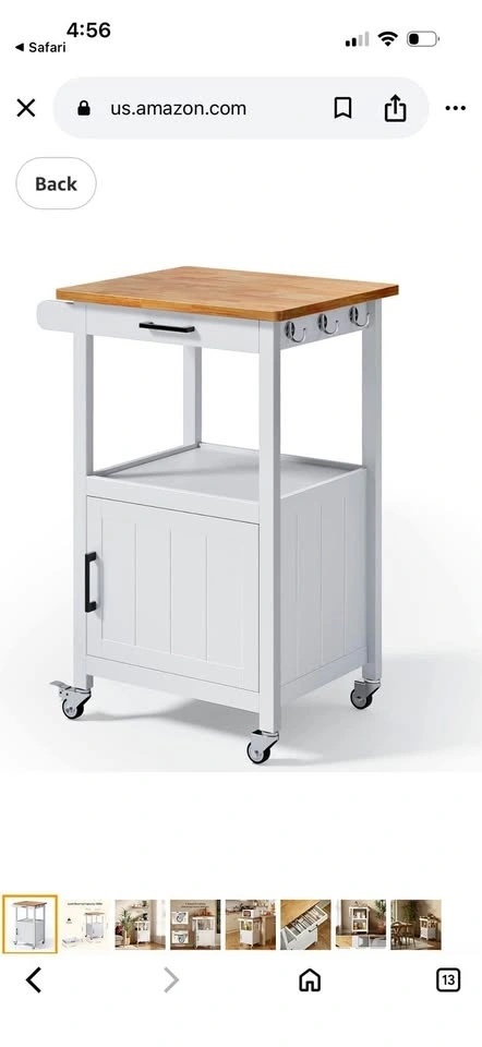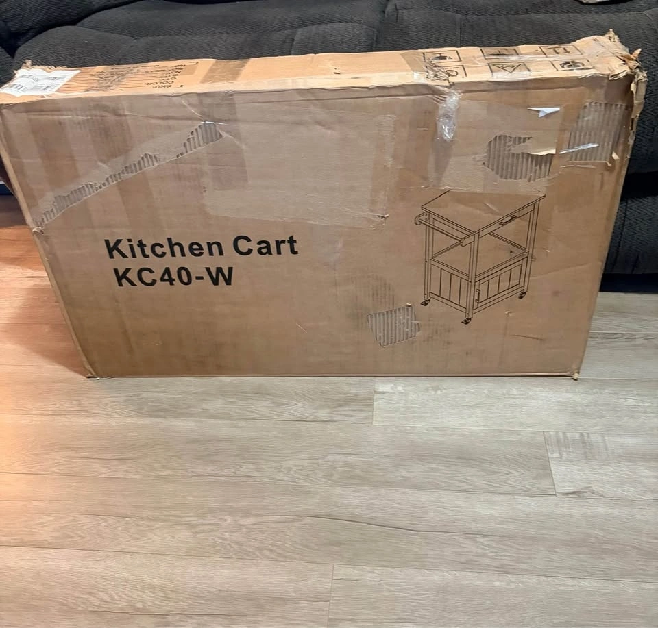 New in box! Kitchen Island Cart for Limited Space. This cart can provide your kitchen with extra storage space and keep it tidy. Features a slide-out drawer, an open storage area, and a cabinet with a door. The countertop is solid wood, perfect as a workspace. It has four 360° smooth-rolling metal wheels, with two lockable for stability. Easy assembly with included instructions and numbered parts. Overall Dimensions: 22.1"(W) x 18.3"(D) x 35"(H).