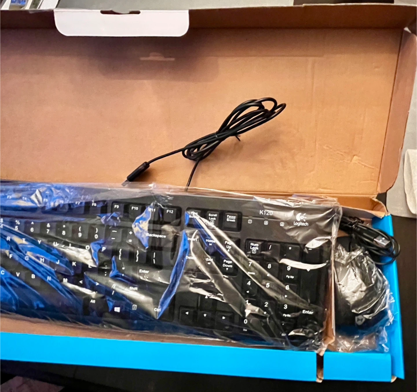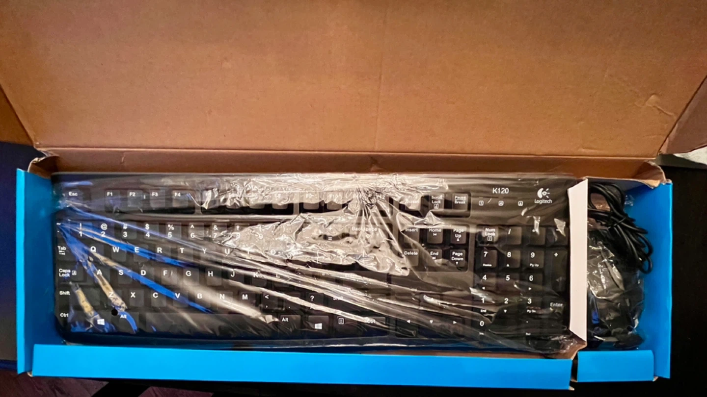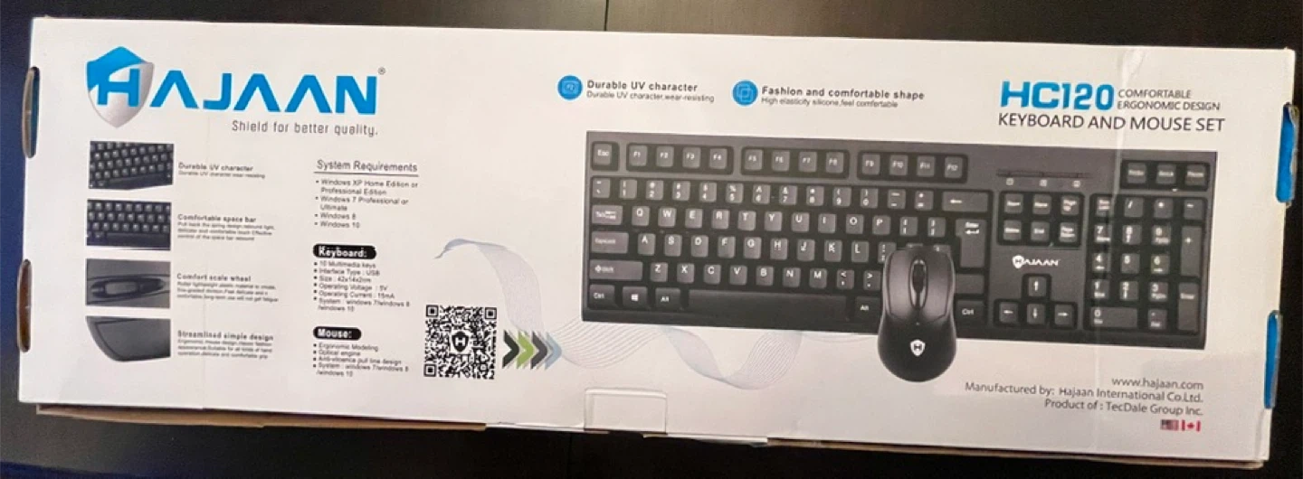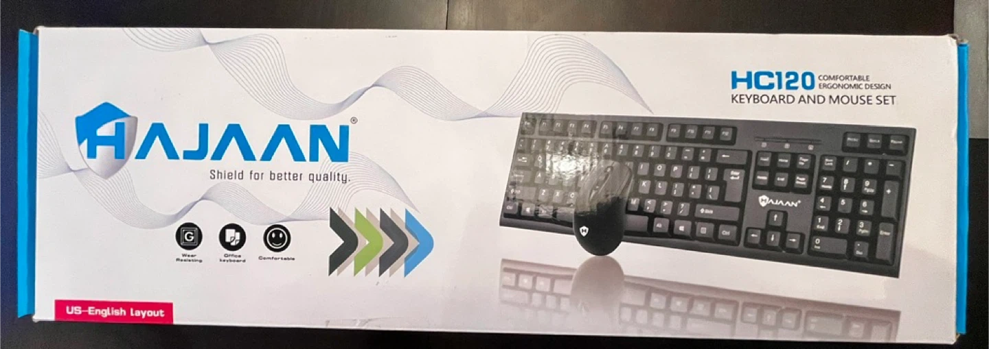 🏆 This is a Hajaan HC120 keyboard and mouse set. It's a full-size keyboard with a numeric keypad. The mouse has an ergonomic design.