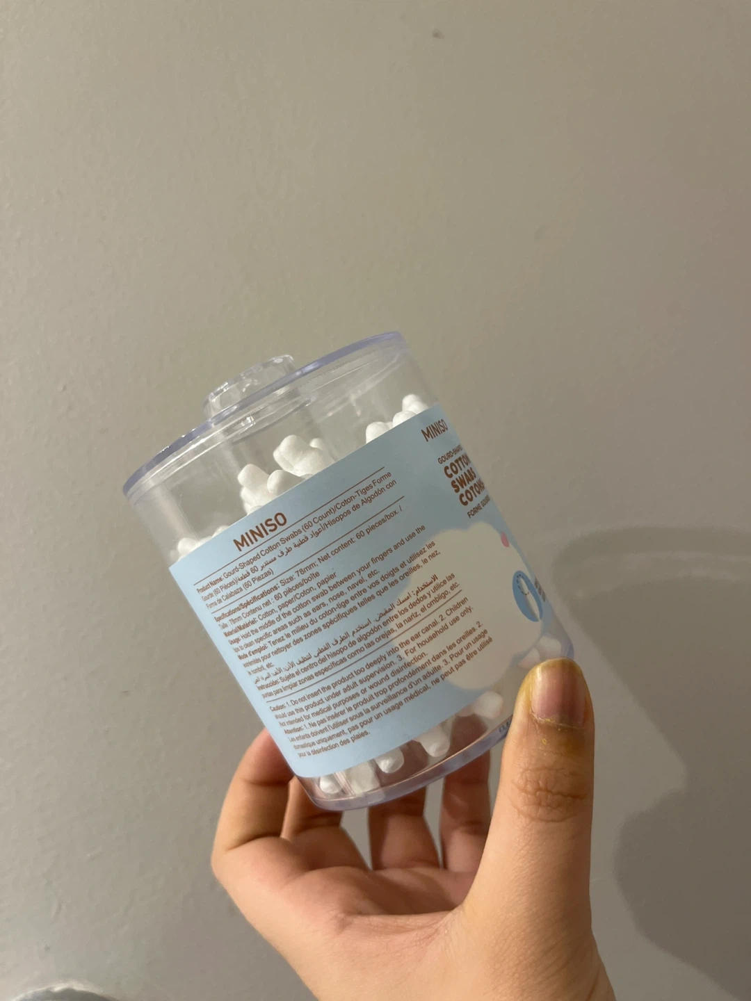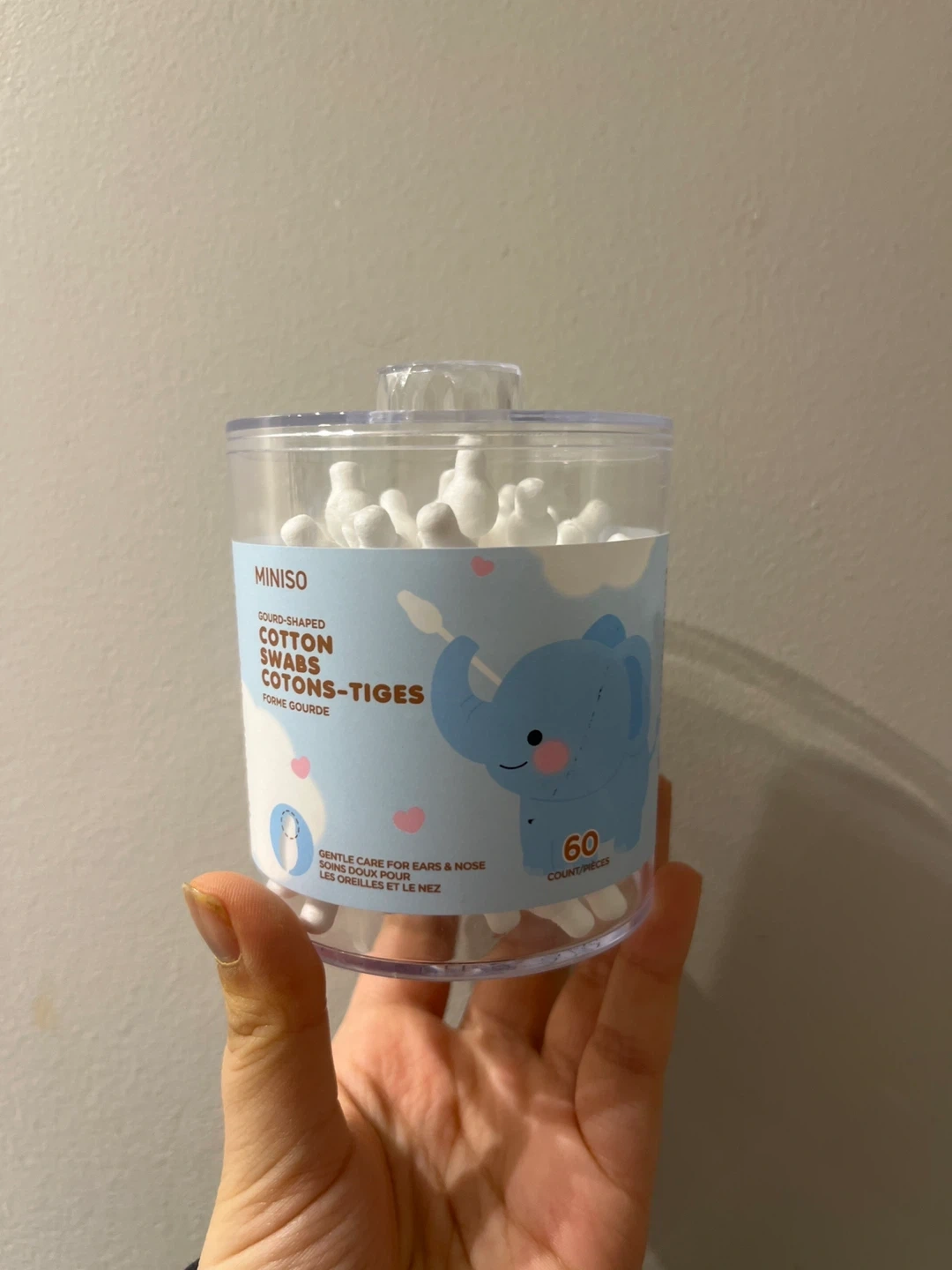 MINISO cotton swabs with a cute sour shape. They're gentle for ears and nose care. Includes 60 pieces in a clear container. Opened and used slightly, but still have some inside, no need anymore