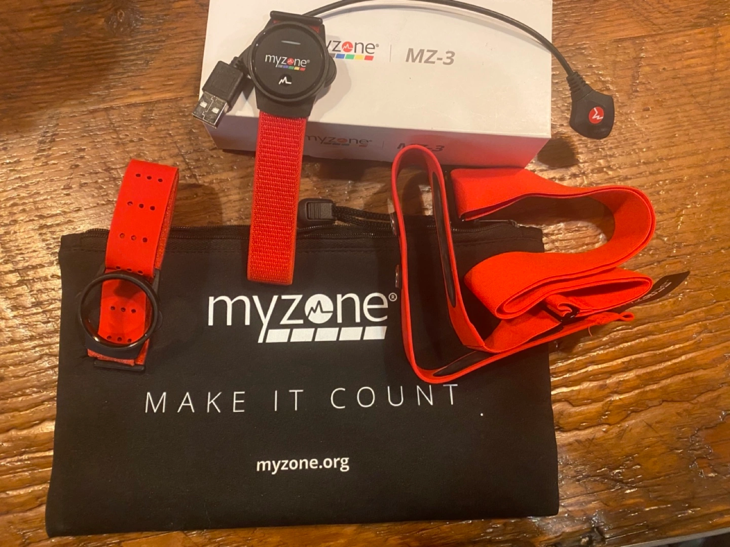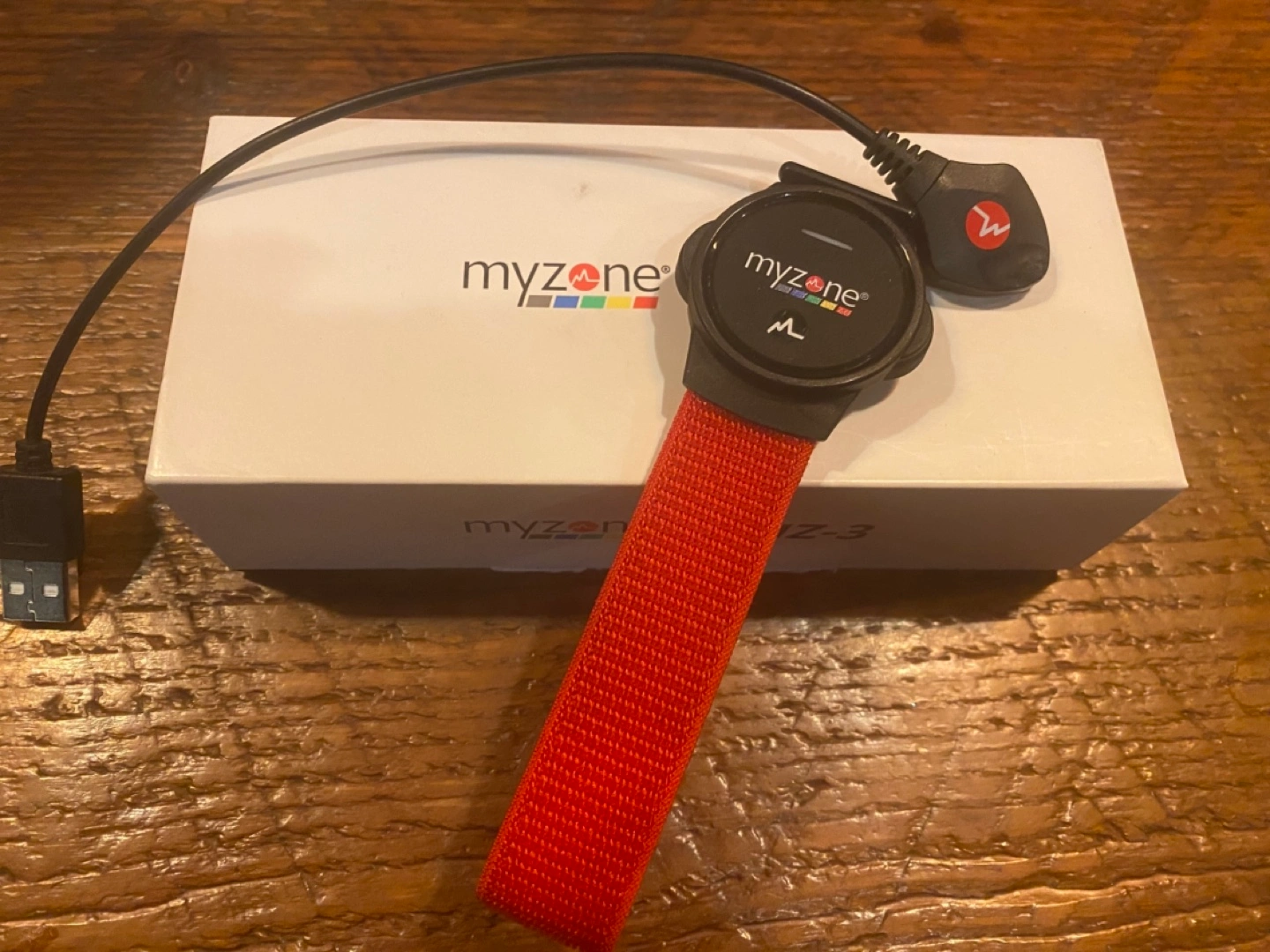 MZ-3 heart rate monitor. Black device with red band. Includes charging cable. Comes in original box. I purchased this for my partner but he only used it a couple times because he has an apple watch he wears. This comes with chest, arm and wrist straps.