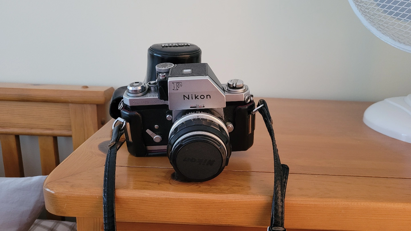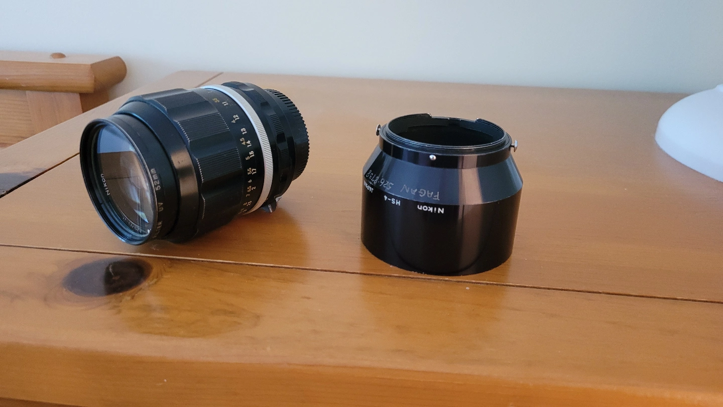 Two 35mm film camera, includes lens and lens hood. Silver body, black leatherette covering. Camera strap attached. Shows some signs of wear.