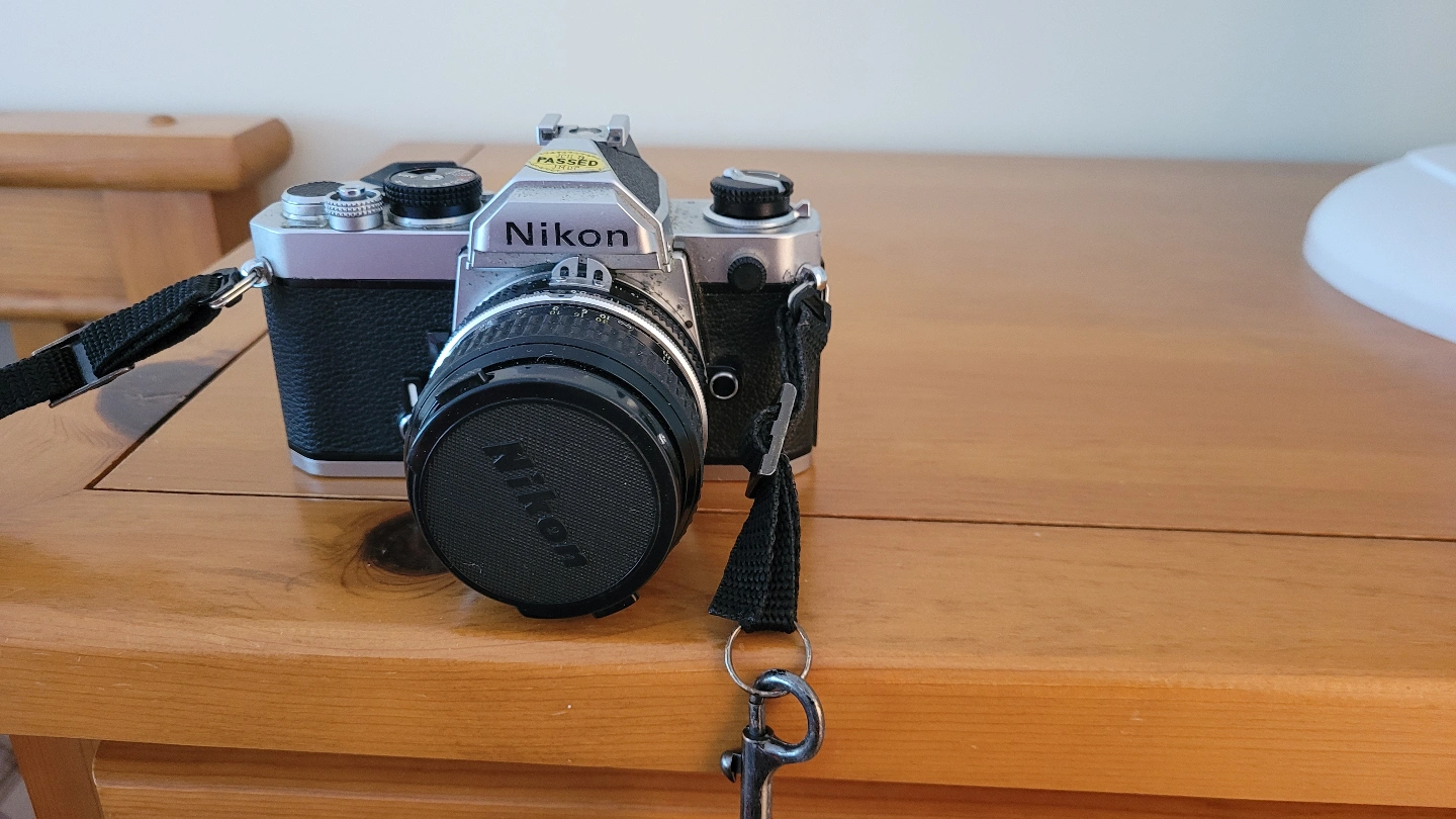 Two 35mm film camera, includes lens and lens hood. Silver body, black leatherette covering. Camera strap attached. Shows some signs of wear.