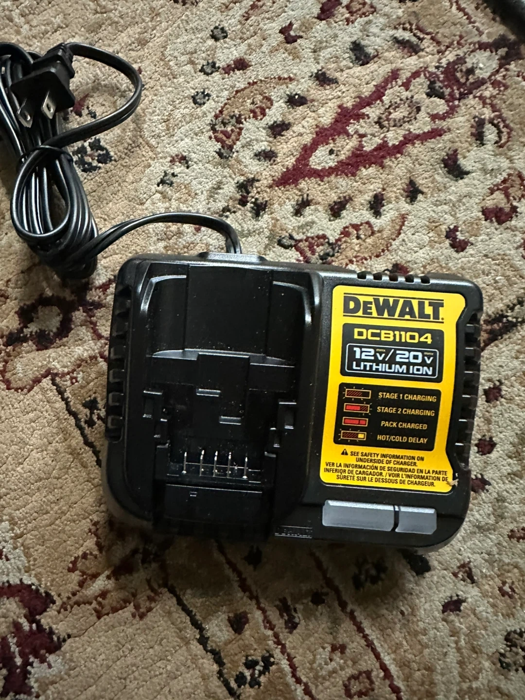This is a DEWALT DCB1104 battery charger. It's designed for 12V and 20V MAX Lithium Ion batteries. The charger has indicators for Stage 1 charging, Stage 2 charging, and Pack Charged.