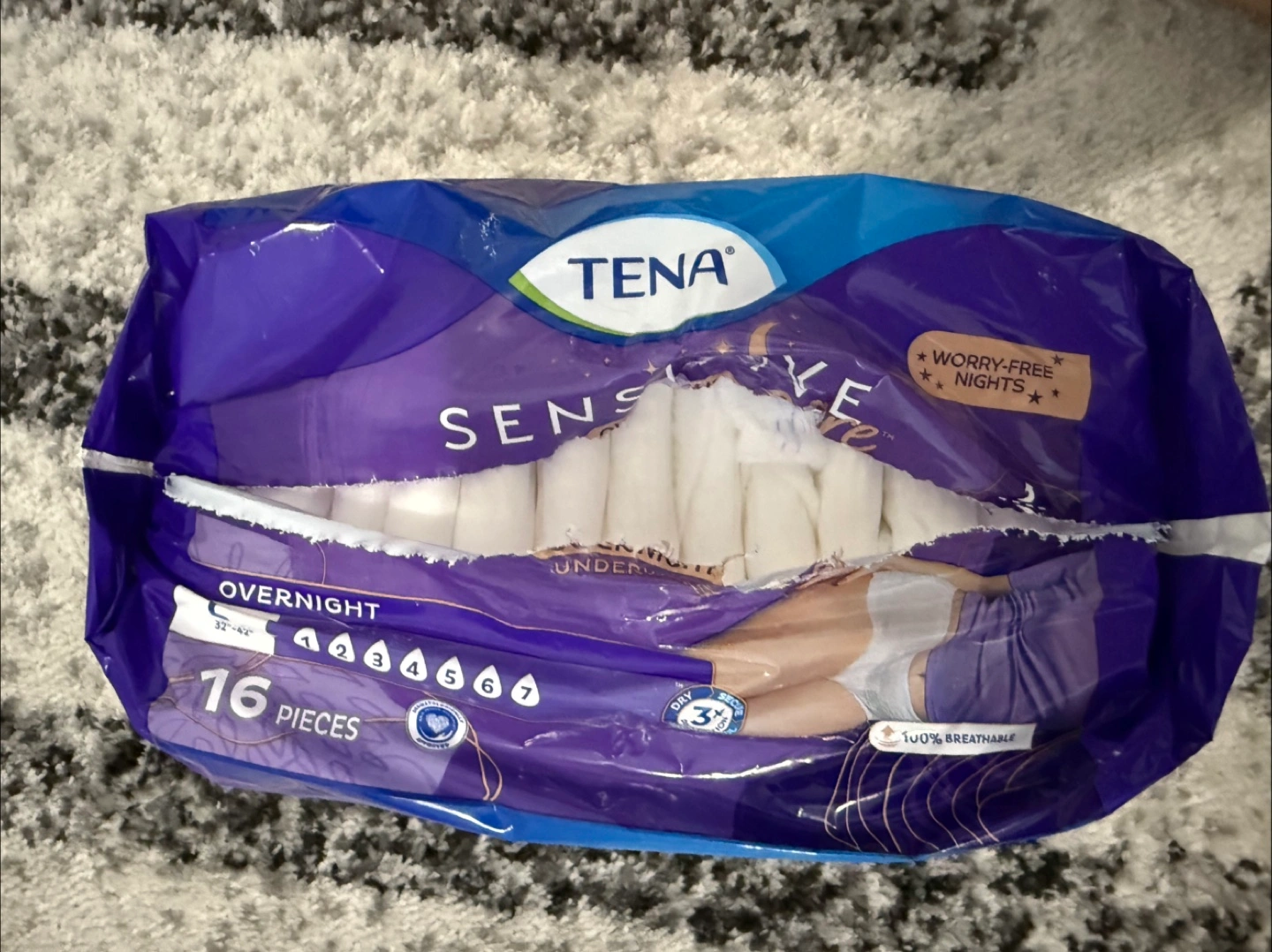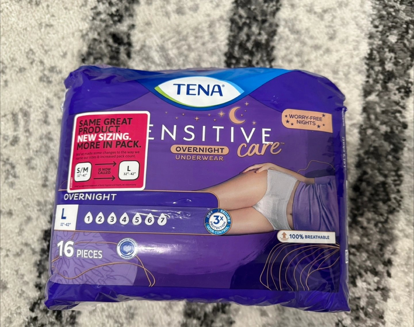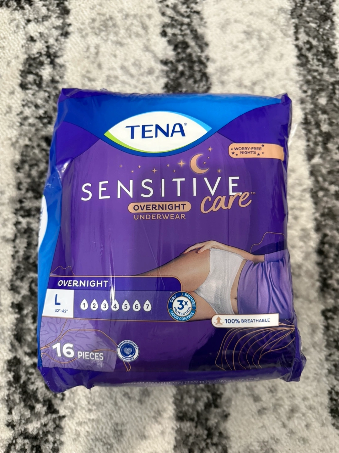 Selling a pack of TENA Sensitive Care Overnight Underwear. The size is Large (L), fitting 32"-42".